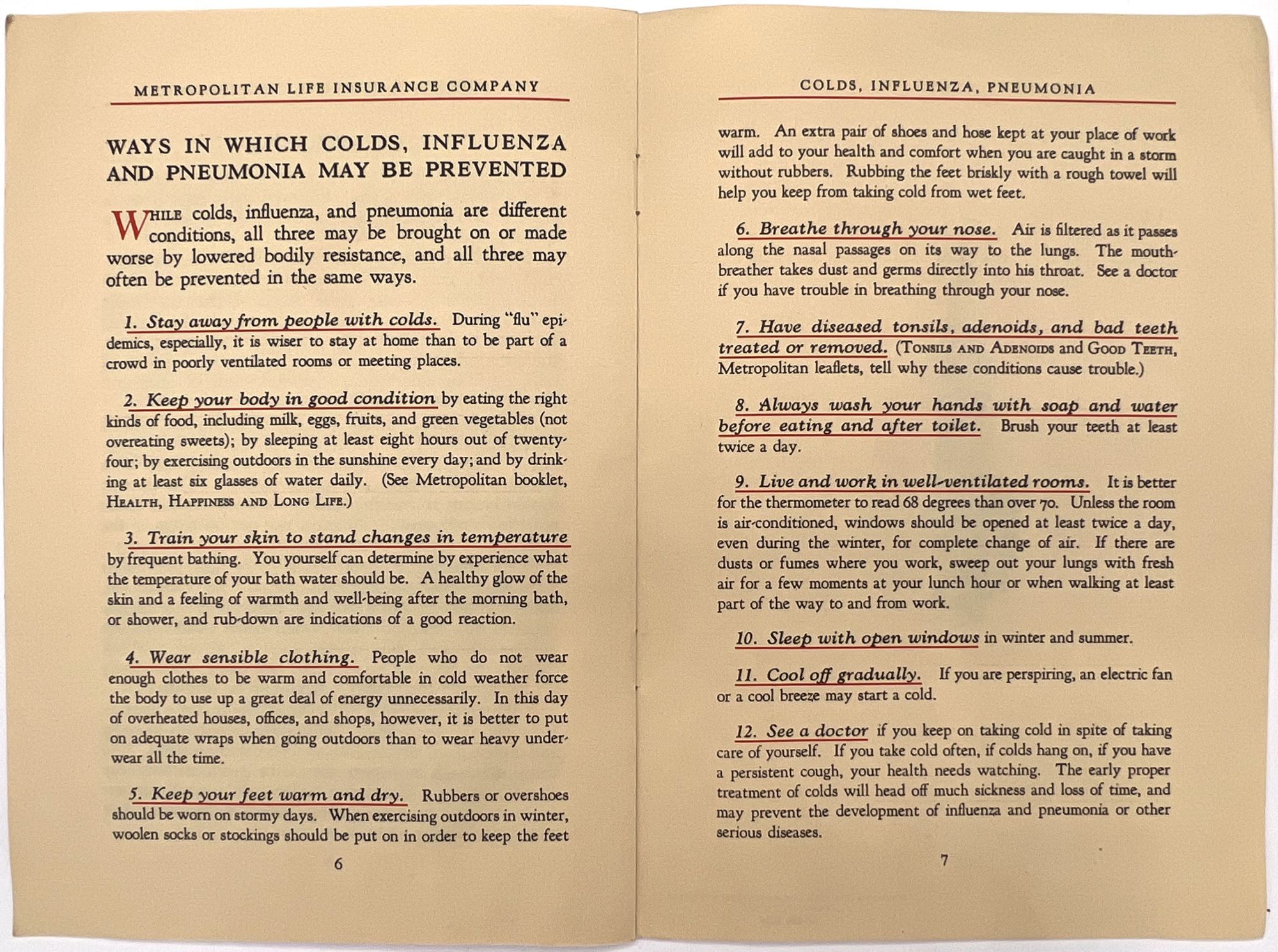 New York, New York: Metropolitan Life Insurance Company, 1940. Very good. Toning, missing surface litho cover.. A pamphlet on the common cold, pneumonia, and influenza, published by the Metropolitan Life Insurance Company to educate American families on how these diseases spread, present, and are treated. Includes a brief 12-step method for preventing the diseases, including social distancing, keeping warm and dry, removing diseased tonsils, and frequent hand-washing. Single vol. (7.75" by 5.25"), pp. 8, stapled in original illus. self wrps. The Metropolitan Life Insurance Company published dozens of public health booklets, offering advice on subjects ranging from healthy eating to the importance of vaccinating children against common diseases and safe teen driving.