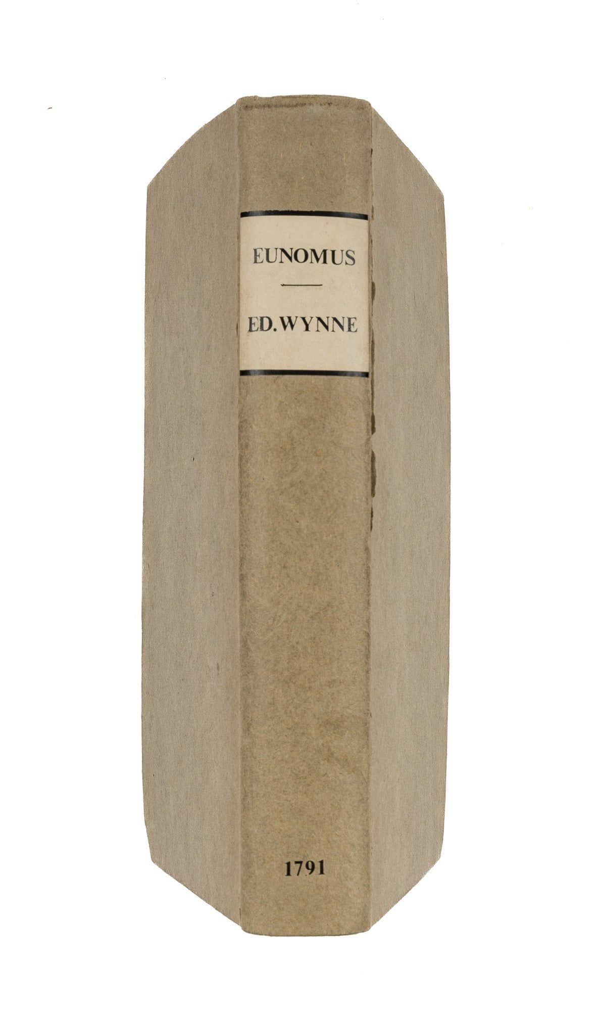 1791. Dublin : Printed for James Moore, 1791.. Dublin : Printed for James Moore, 1791. "A Most Attractive and Instructive Book" Wynne, Edward [1734-1784]. Eunomus: Or, Dialogues Concerning the Law and Constitution of England. With an Essay on Dialogue. Dublin : Printed for James Moore, No. 45, College-Green, 1791. xli, [3], 444, [8] pp. Octavo (7-3/4" x 4-3/4"). Recent paper-covered boards, printed paper title label and black-stamped publication date to spine, endpapers renewed. Light soiling, joints just starting at head, moderate rubbing to spine ends. Moderate toning to interior, light foxing in places, leaf of unrelated notes in contemporary hand tipped-in to renewed endleaf, nineteenth-century owner inscription, "Wm. Johnson's," to head of title page. $350. * "Third" edition, a reprint of the second London edition, 1785. First published in 1768, this well-regarded textbook for aspiring lawyers went through five editions, the last in 1822 (reissued in 1828). Marvin notes: "Elegance of diction, appropriateness of illustration, and novelty of method combine to make Eunomus a most attractive and instructive book. The origin and spirit of legal principles, the practice of the Courts, and information of general professional interest, are carefully examined and soundly explained." This copy may have been owned by William Johnson [1769-1848], the notable New York lawyer and New York Chancery and Supreme Court reporter. This is a scarce imprint. OCLC locates 8 copies in North American law libraries (Boston University, Columbia, DePaul, Georgetown, University of Georgia, University of Minnesota, University of Pennsylvania, University of Washington). Marvin, Legal Bibliography 751. English Short-Title Catalogue N2319.