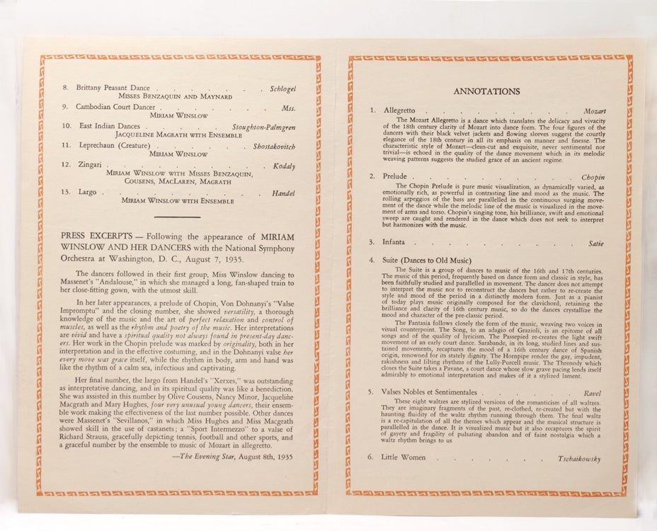 [New York]: The Community Concert Service/ Miriam Winslow, 1935. Original dance program for a [circa 1935] performance by "Miriam Winslow and Her Dancers," signed by Miriam Winslow, and eight(8) other members of her dance company: Barbara Benzaquin, June MacLaren, Jacqueline Magrath, Christine Maynard, Wendolyn Bever, Olive Cousens, Mary Morse, and Mary Campbell (the pianist). Rear cover has faint crease on lower spine, else a near fine, bright copy. Original dance program for a [circa 1935] performance by "Miriam Winslow and Her Dancers," signed by Miriam Winslow, and eight(8) other members of her dance company: Barbara Benzaquin, June MacLaren, Jacqueline Magrath, Christine Maynard, Wendolyn Bever, Olive Cousens, Mary Morse, and Mary Campbell (the pianist). Miriam Winslow originally trained with Ted Shawn, and then moved to Europe, to train under Mary Wigman and Harold Kreutzberg. In 1929 she began the Miriam Winslow School of Dance, in Boston. In 1935 she joined Foster Fitz-Simons (a member of Ted Shawn's all-male dance group), and they toured the United States, and globally, until 1943, when Winslow settled in Buenos Aires. She stayed in Buenos Aires, performing and teaching, until 1961, when she returned to the U. S. and became a sculptor [For more about Miriam Winslow, and her dance troupe, including the important role she played in the evolution of dance in the United States, see Weber, 'The Evolution of Aesthetic and Expressive Dance in Boston']. This program is unrecorded by OCLC [which does locate other programs for performances presented by The Community Concert Association, including other dance performances in 1935]