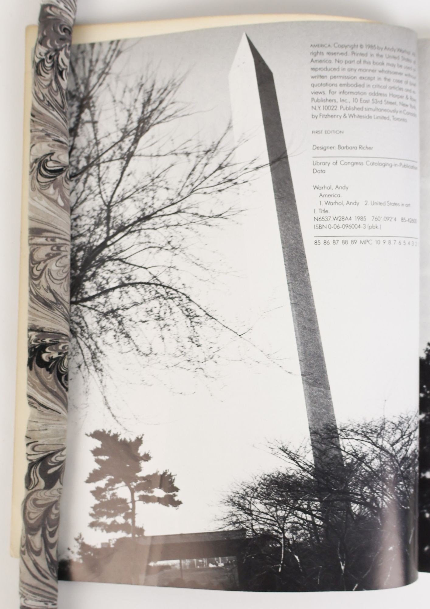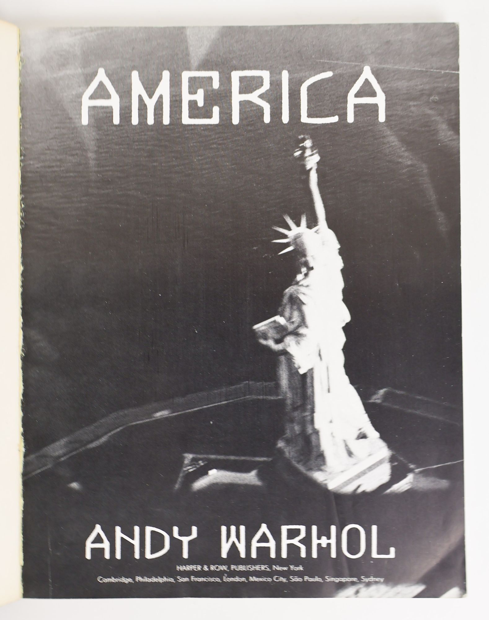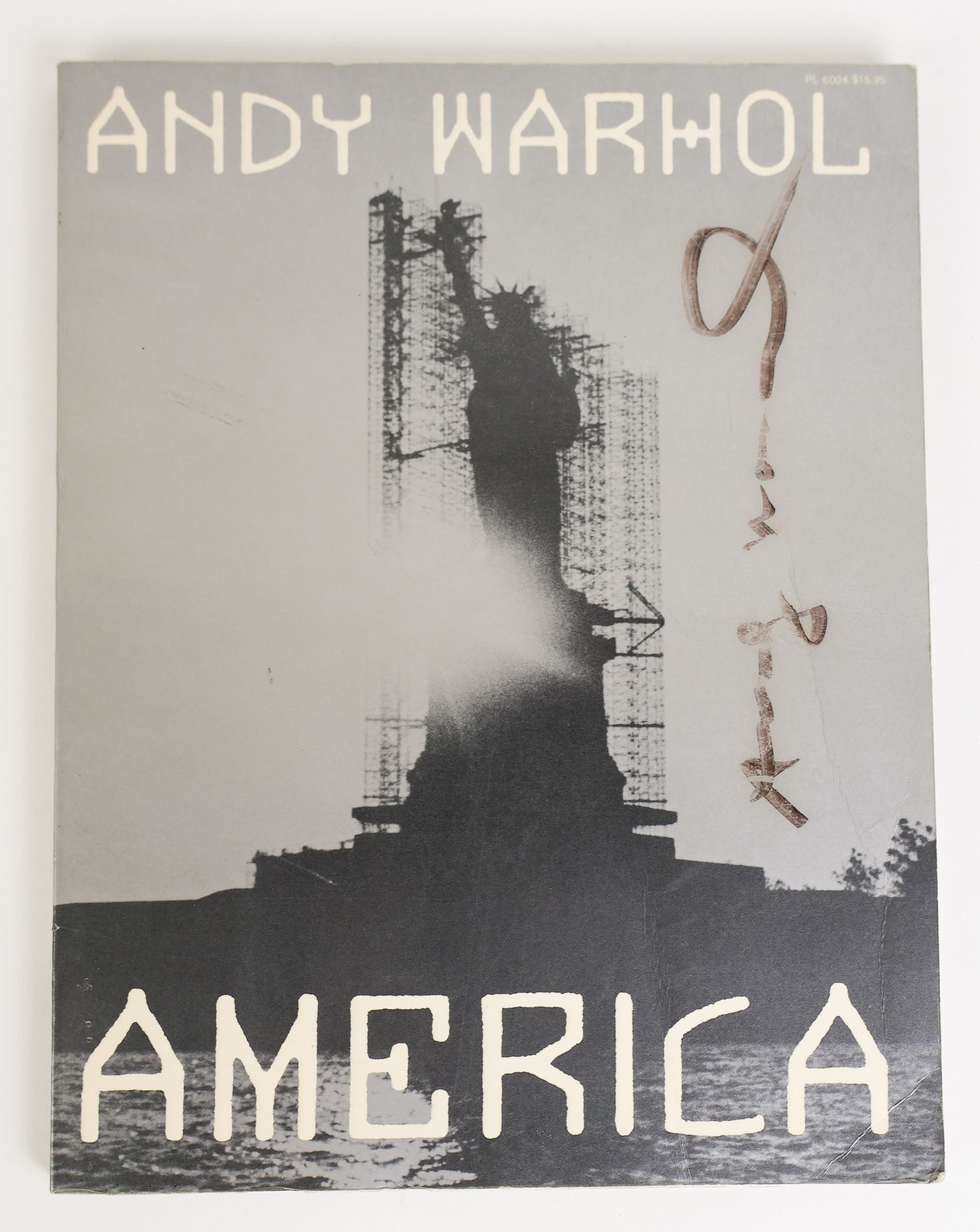 Silver and gray pictorial spine with black lettering. Mild shelf wear, including edgewear and creasing to covers; mild wear/scratching to text block; occasional creasing to pages, as well as open tearing to pages 61-62. Signed by Warhol on front cover and inscribed by Warhol on page 8. DL consignment. Shelved in Case 11. 1395709. Shelved Dupont Bookstore.