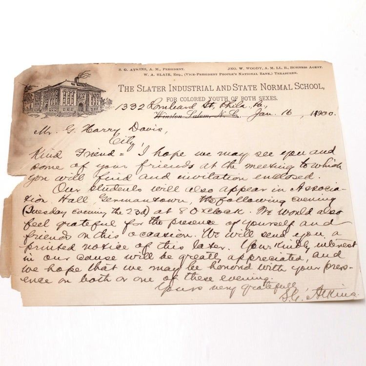 Philadelphia, 1900. 1 page On Slater letterhead. Blank verso has paper residue (where once mounted), paper is quite tanned along left margin, with creasing, few short tears and small chips (in blank margins), else a good copy. 1 page On Slater letterhead. Dr. Simon Green Atkins, the son of former slaves, founded the Slater Industrial and State Normal School, in 1892, in Winston-Salem, North Carolina. The school became Winston-Salem Teacher's College in 1925, and it was the first African-American institute in America to offer degrees in elementary education.