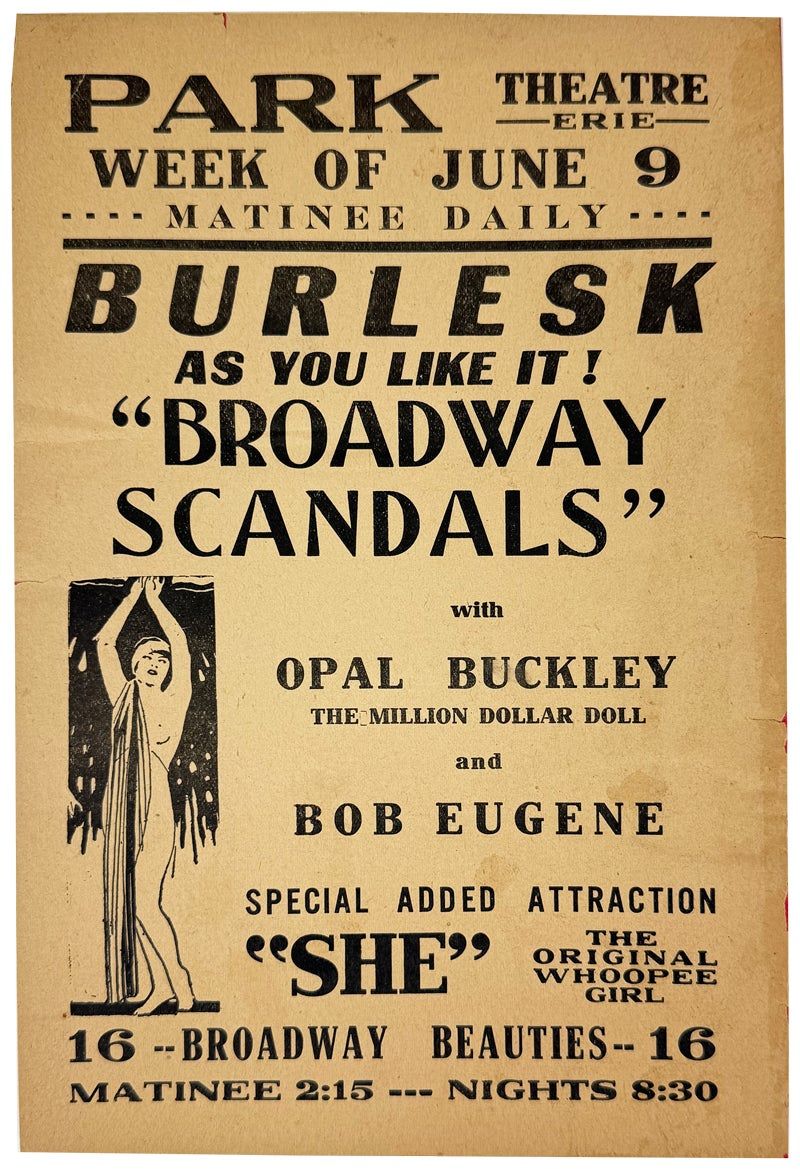 Small handbill issued by the Theatre Erie for a daily matinee the week of June 9 featuring "Broadway Scandals" with "million dollar doll" Opal Buckley and Bob Eugene. Also features "Special added attraction 'SHE' the original whoopee girl" and sixteen Broadway beauties.
