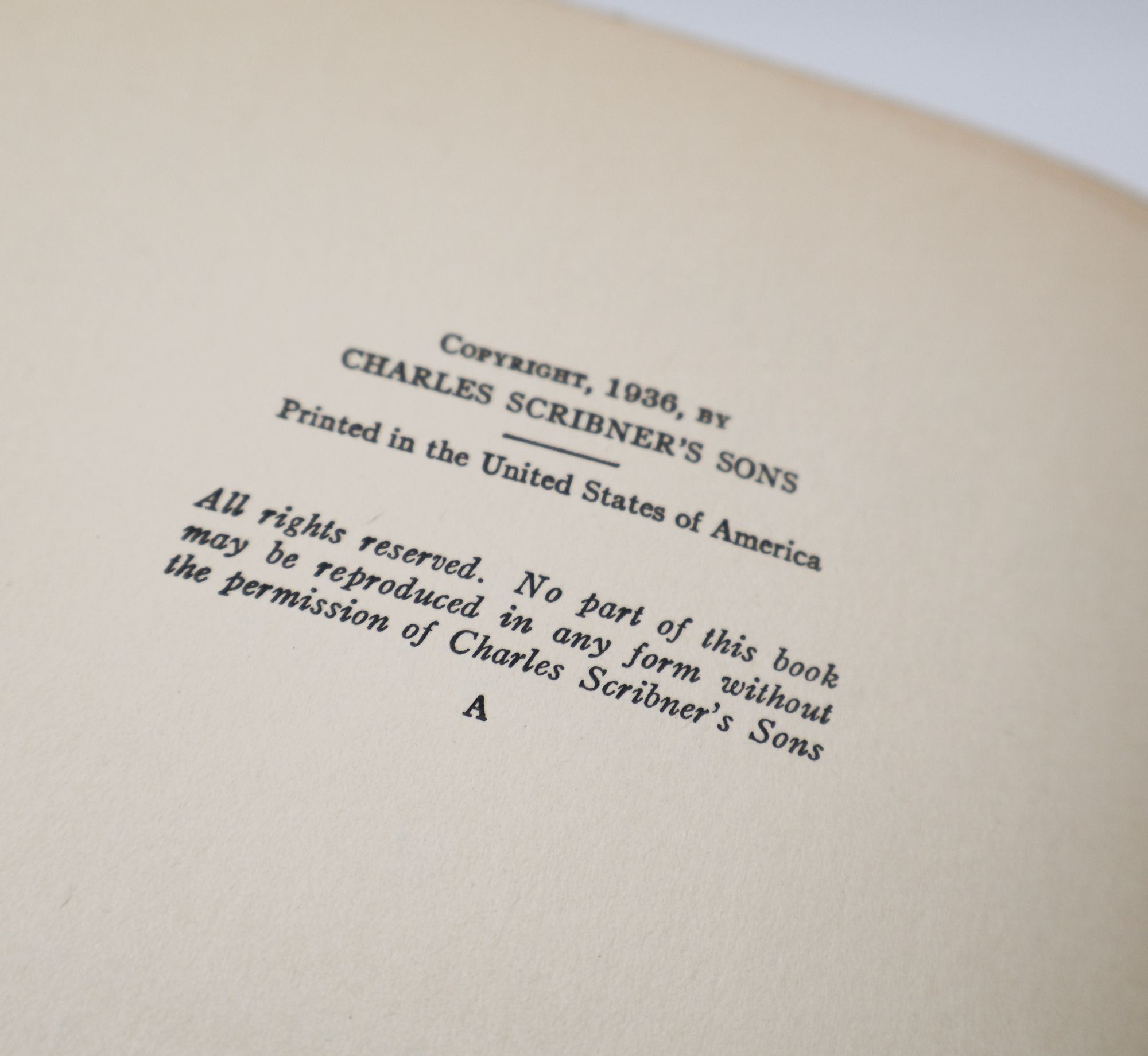 New York: Charles Scribner's Sons, 1936. First Edition, First Printing. Hardcover. Octavo, 240 pages. In Good condition with a Very Good dust jacket. Spine tan and blue with tan lettering. Dust jacket protected with a mylar covering, price uncut: "$2.50." Sunning to spine. Mild chipping and tearing along edges of dust jacket. Water staining to boards, causing slight warping. Foxing to edges of textblock. Staining to endpapers and pastedowns. Age toning throughout. Shelved under Front Counter. 1395734. Shelved Dupont Bookstore.