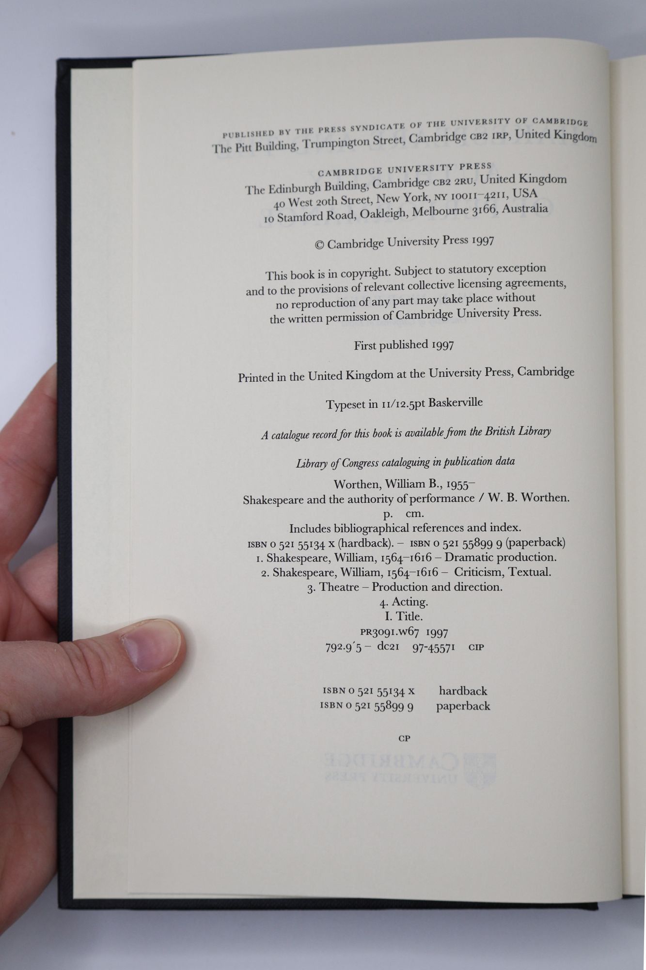 Cambridge: Cambridge University Press, 1997. First Edition. Hardcover. Octavo, 255 pages. In Very Good condition. Bound in publisher's black cloth with gilt lettering to spine. Minor general shelf wear. Barcode sticker adhered to rear board. Textblock clean. Shelved in Shakespeare Criticism. 1395742. Shelved Dupont Bookstore.