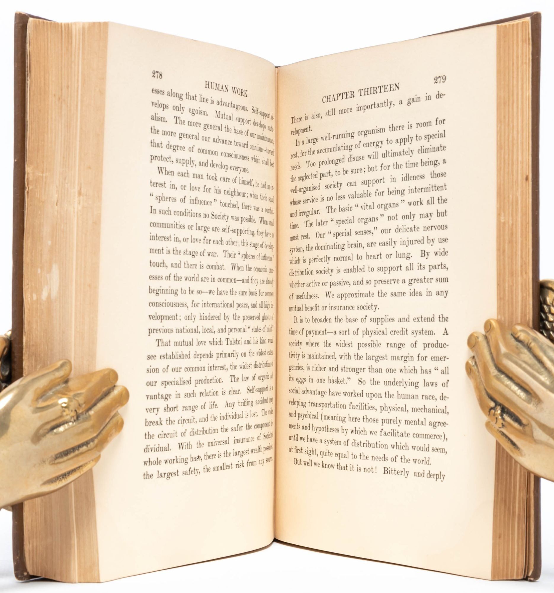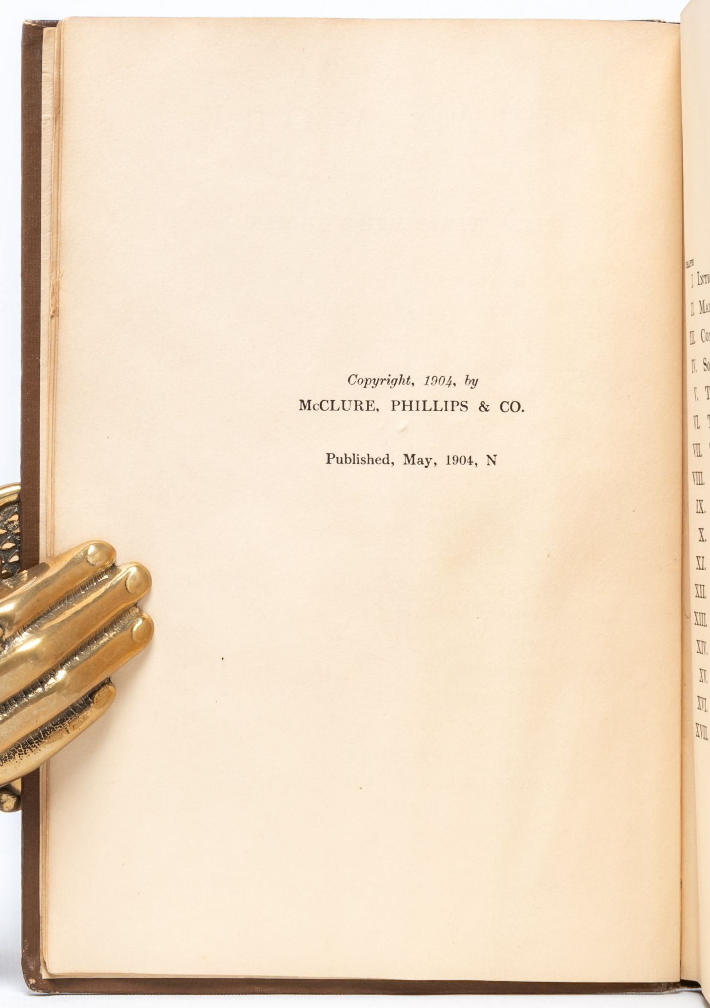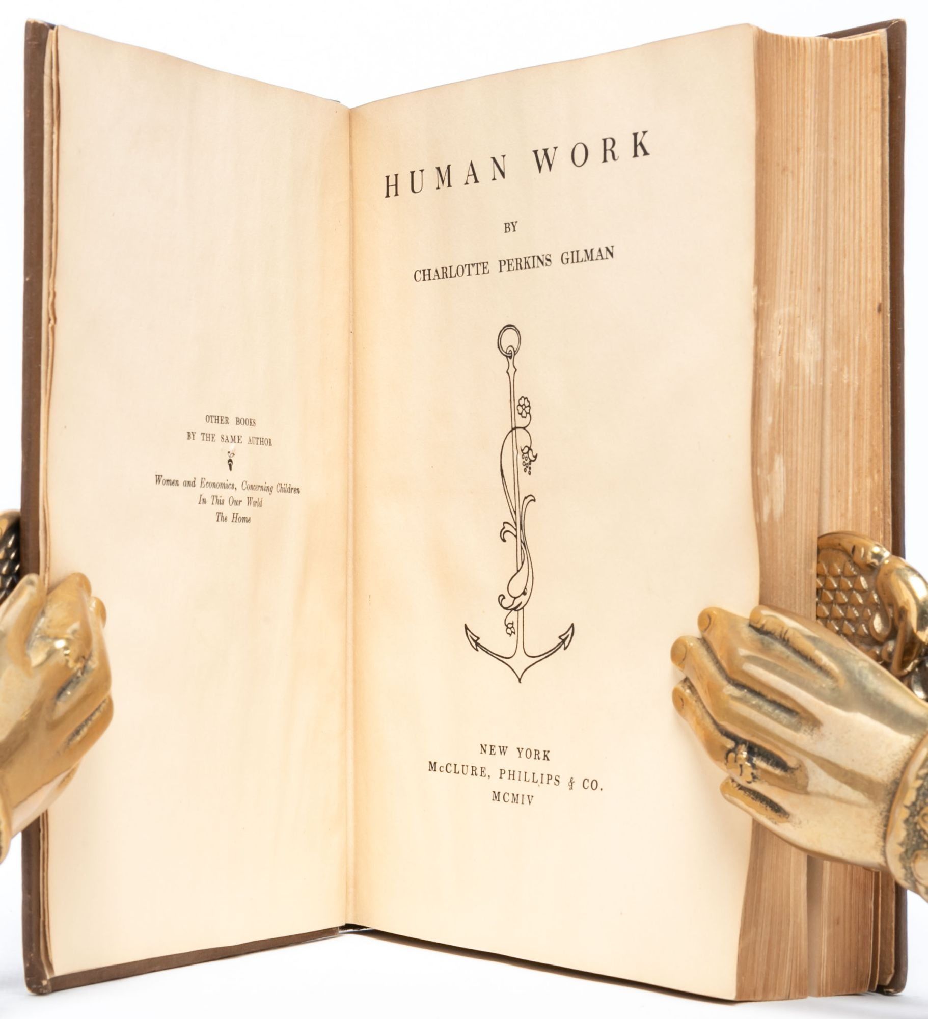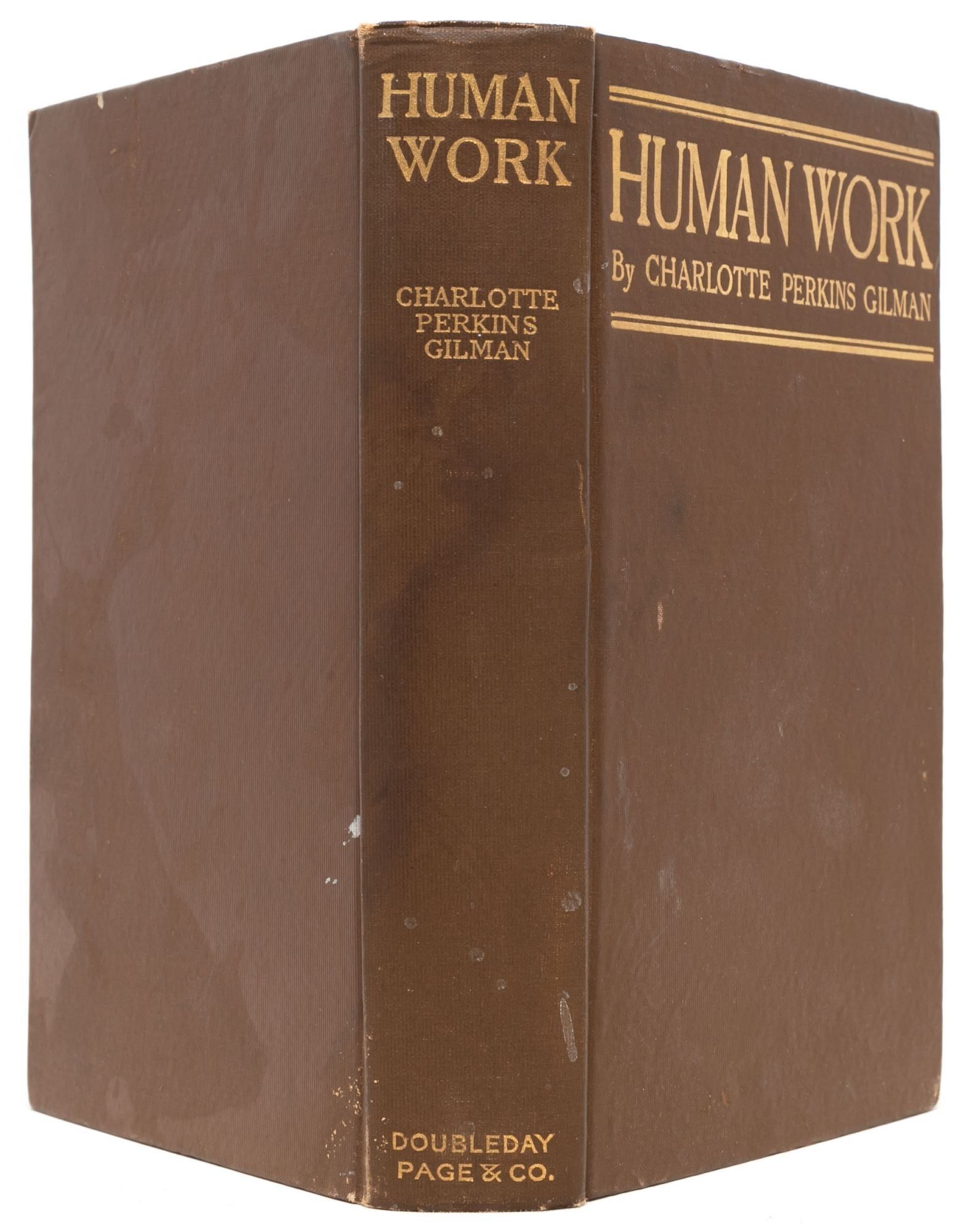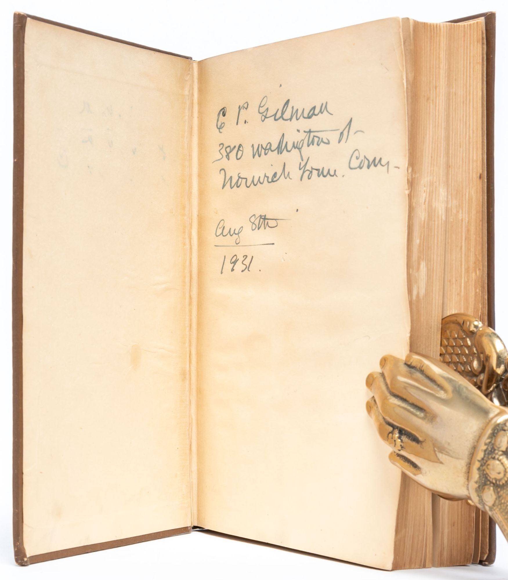 New York: McClure, Phillips & Co, 1904. First edition. Very Good. With the ownership signature of Charlotte Perkins Gilman ("C.P. Gilman"), her address (380 Washington St in Norwich, Connecticut, where she and her husband Houghton Gilman lived from 1922 to 1934), and the date ("Aug 8th 1931") in ink to front flyleaf. Octavo. Publisher's brown cloth titled in gilt. Inner hinges expertly closed. Some dampstaining, causing a few blemishes to cloth and some wrinkling to leaves in first half of the book. Still a Very Good example of an important book by one of America's leading women's rights activists, this copy having belonged to the author herself. Housed in a custom green quarter morocco case.