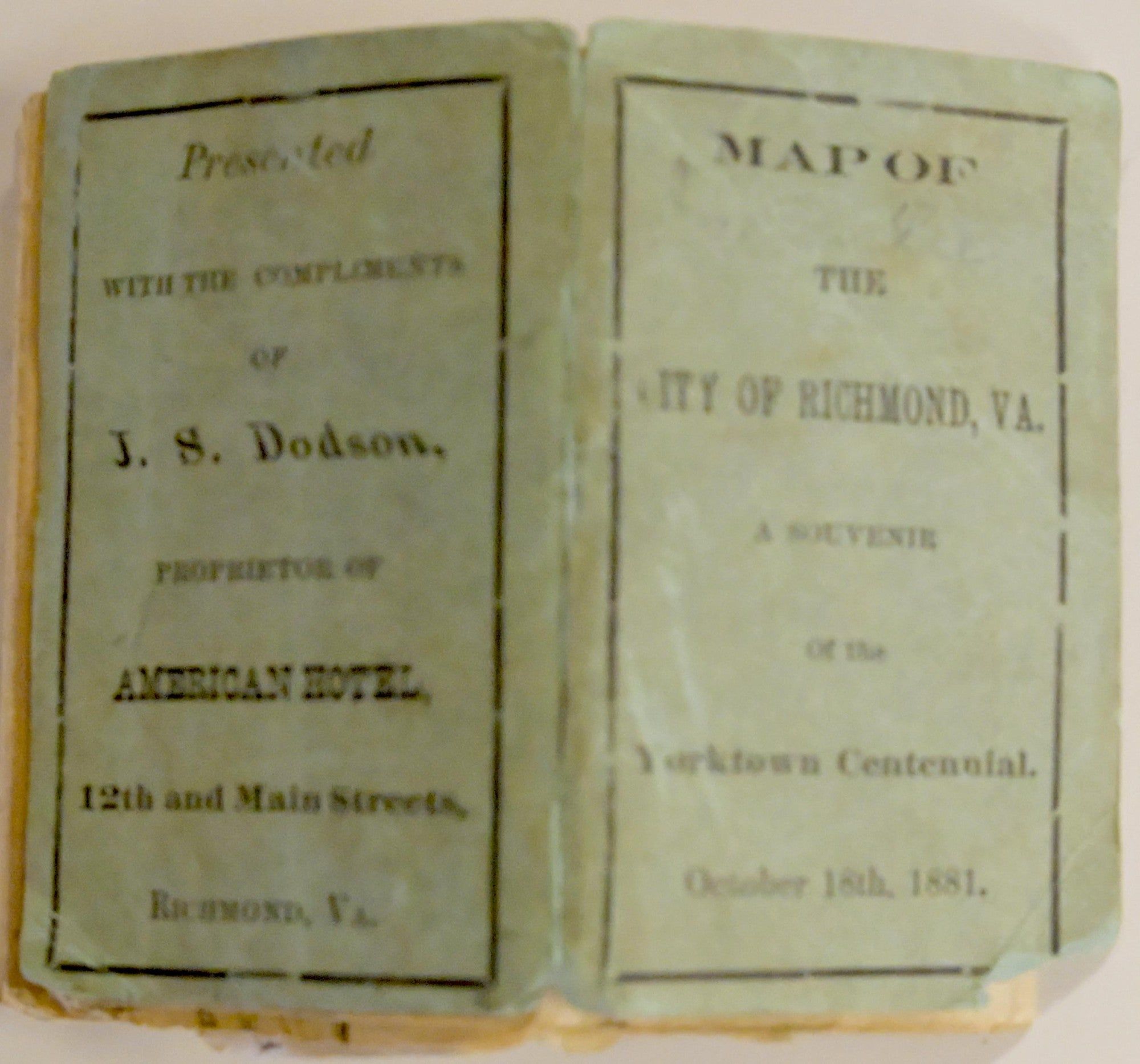 [Richmond?]: [Not identified], 1881. Soft Cover. Good binding. A folding map, in worn printed wrappers; the wrappers are 3 /18” x 1 7/8”; the map itself when unfolded is 9 1/2” x 14 1/4”; the wrappers are chipped, not affecting any text; the folded map is separated at several of the folds; it has a “Key” in the top corner identifying various historic sites in Richmond; it is printed in black and white.~~The printing on the rear cover: “Presented | with the compliments | of J. S. Dodson, | Proprietor of ? American Hotel | 12th and Main Streets, | Richmond, Va.”~~Surely on the least common of the maps of Richmond. We find but two copies in insittutional holdings -- one at the Huntington Library; the other among the substantial miniature book collection at a Virginia institution. The rear panel of the latter copy notes a different Hotel for distribution. This suggests if was printed up as a “give-away” to be distributed at hotels to visitors in the area who are attending the Yorktown Centennial Celebration.~~. Good binding.