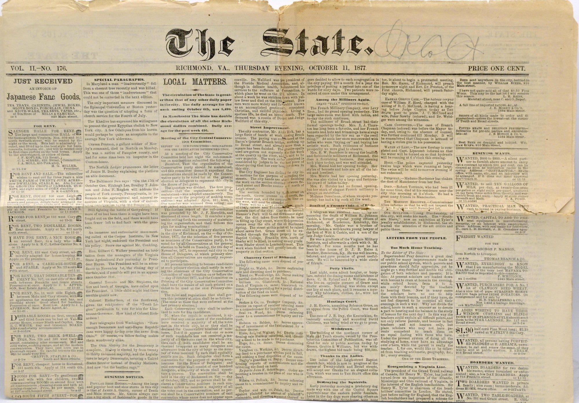 Richmond, VA, 1877. 24” x 16 ½” folded in fourths horizontally and in half vertically. Worn with minor tearing along folds. Vol. II, No. 176, October 11, 1877. 4pp. ~~Owned and edited by John Hampden Chamberlayne (1838-1882), a Confederate lawyer who served as an aid to General A.P. .Hill, and later as a Virginia Delegate in 1879-1880. His war letters were posthumously published in “Ham Chamberlayne – Virginian”, 1932.~ ~Chamberlayne’s paper circulated in Manchester for 1 cent/issue, 6 days/week. This issue shows a printing error at the bottom left 1st page from a divot in the paper. The “Situation in France” and a reprint of Adolphe Thiers’ farewell address take up the bulk of the content aside from classifieds. Of interest are a piece about the “racy” performance of 3 blonde women called the “Dizzies” in “overcoming” makeup who sang and danced at an unnamed venue, and a section of “Special Paragraphs” in which the following chastisement from Chamberlayne reads, “Still fighting the Battle of Gettysburg? If there had been more of us there it might have been fought out on the field, and there would have been fewer left to find fault with the generals”.~ ~ Fair-Good.~.