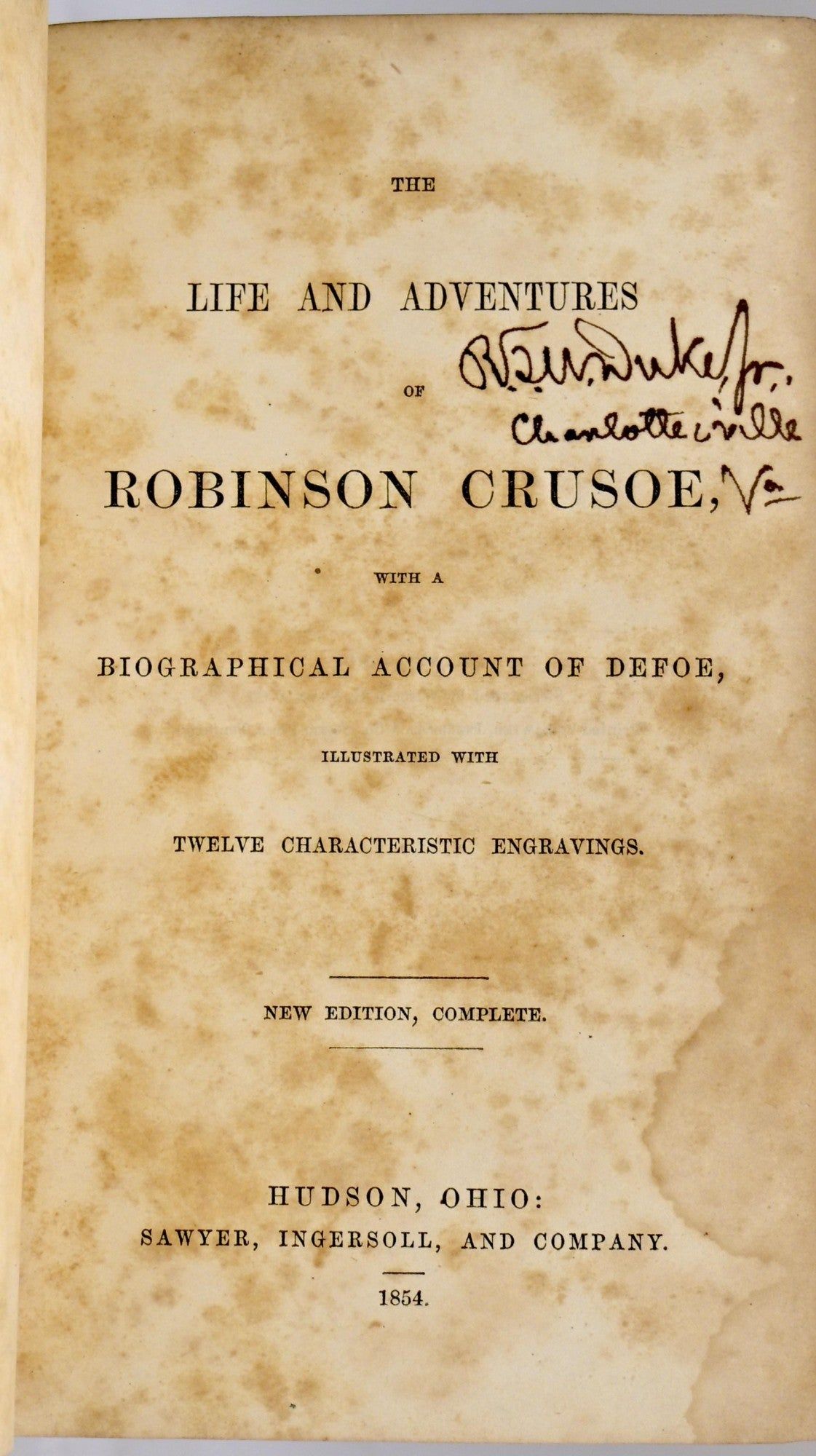 Hudson: Sawyer Ingersoll and Company, 1854. Good binding. 8vo; quarter morocco over marbled boards; with 5 raised bands and horizontal tilting on the spine in gilt;(ii) xx, 21-612 pages; the edges are scuffed with some surface loss particularly to the spine; minor scratches to the boards; foxing throughout; complete with 12 striking engravings by W.T Norman. ~~~There is a previous owner’s name on the front end paper and a very sweet inscription on the first blank leaf “This is the first book I ever owned. Given to me by my father when I was two years old when my name was already always written below by mother.” - J.W. Duke from his father 1855. Good binding.