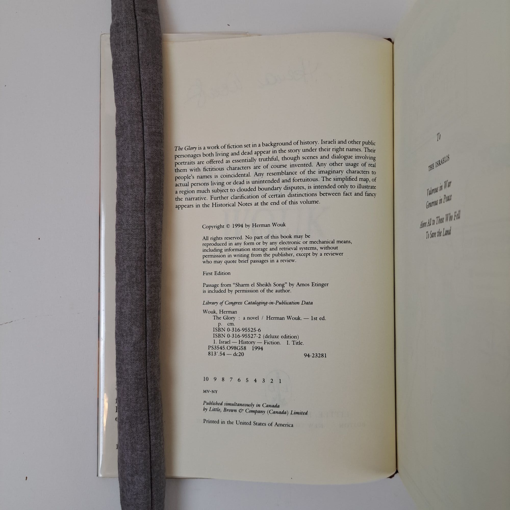 Boston, Massachusetts and New York, New York: Little, Brown, 1994. First Edition, First Printing. Hardcover. Octavo, 685 pages. In Very Good minus condition with Very Good condition dust jacket. Spine is brown with gilt and yellow lettering. Dust jacket is protected by mylar covering, price uncut: "$24.95" on front flap, and has mild creasing along spine head and tail. Boards have mild shelving wear along extremities. Text block has moderate foxing along edges, faint gray smudging along tail edge. Signed flat by Herman Wouk on title page. Shelved in Room C. 1395850. Special Collections.