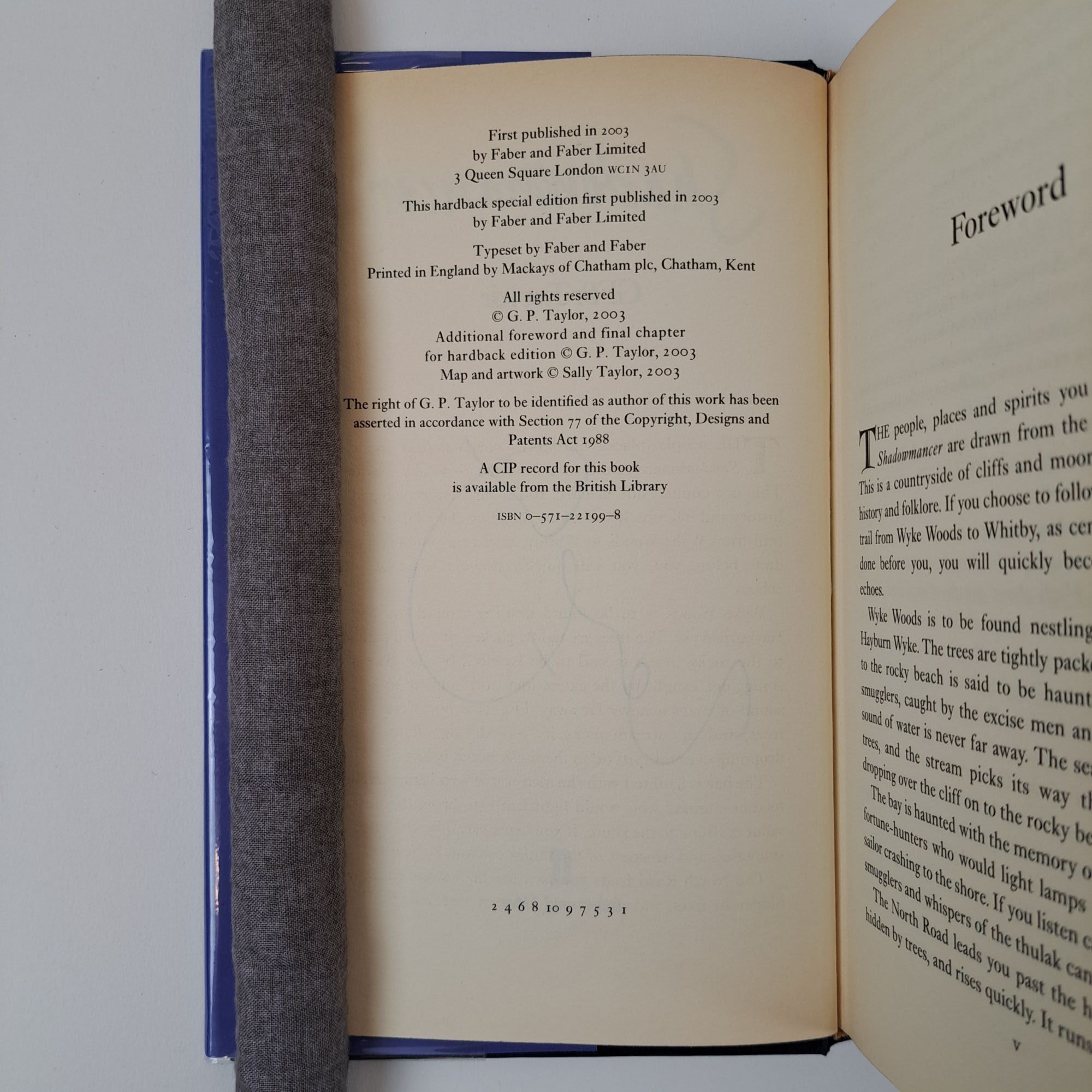 London, UK: Faber & Faber, 2003. First Edition, First Printing. Hardcover. Octavo, 308 pages. In Very Good condition with Very Good minus condition dust jacket. Spine is gilt with navy lettering. Dust jacket protected by mylar covering, price uncut: "£14.99" on front flap, and has mild shelving wear along spine head and tail, moderate bending wear along front head edge. Boards have mild shelving wear along spine head and tail. Text block edges dyed navy with mild scuffing; mild agetoning throughout interior. Signed flat on title page by G.P. Taylor. Shelved in Room C. 1395856. Special Collections.
