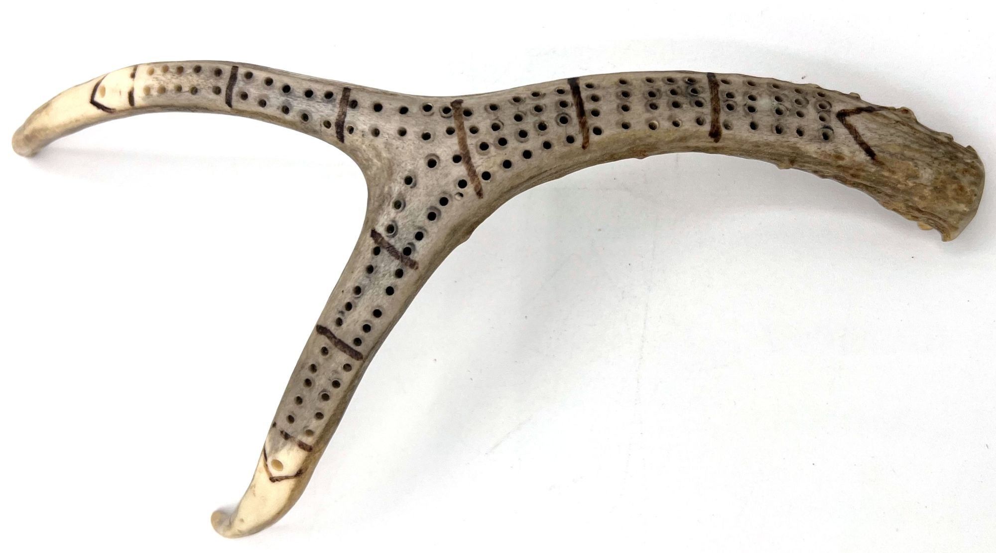 United States, Late 19th. cent. Very good. Minor dust soiling, surface wear.. Hand crafted cribbage board made from an animal horn circa the late 19th century, with dozens of holes bored into the horn and lined in several places with ink for easy game play. Measures approx. 10" by 4.5" by 2.25