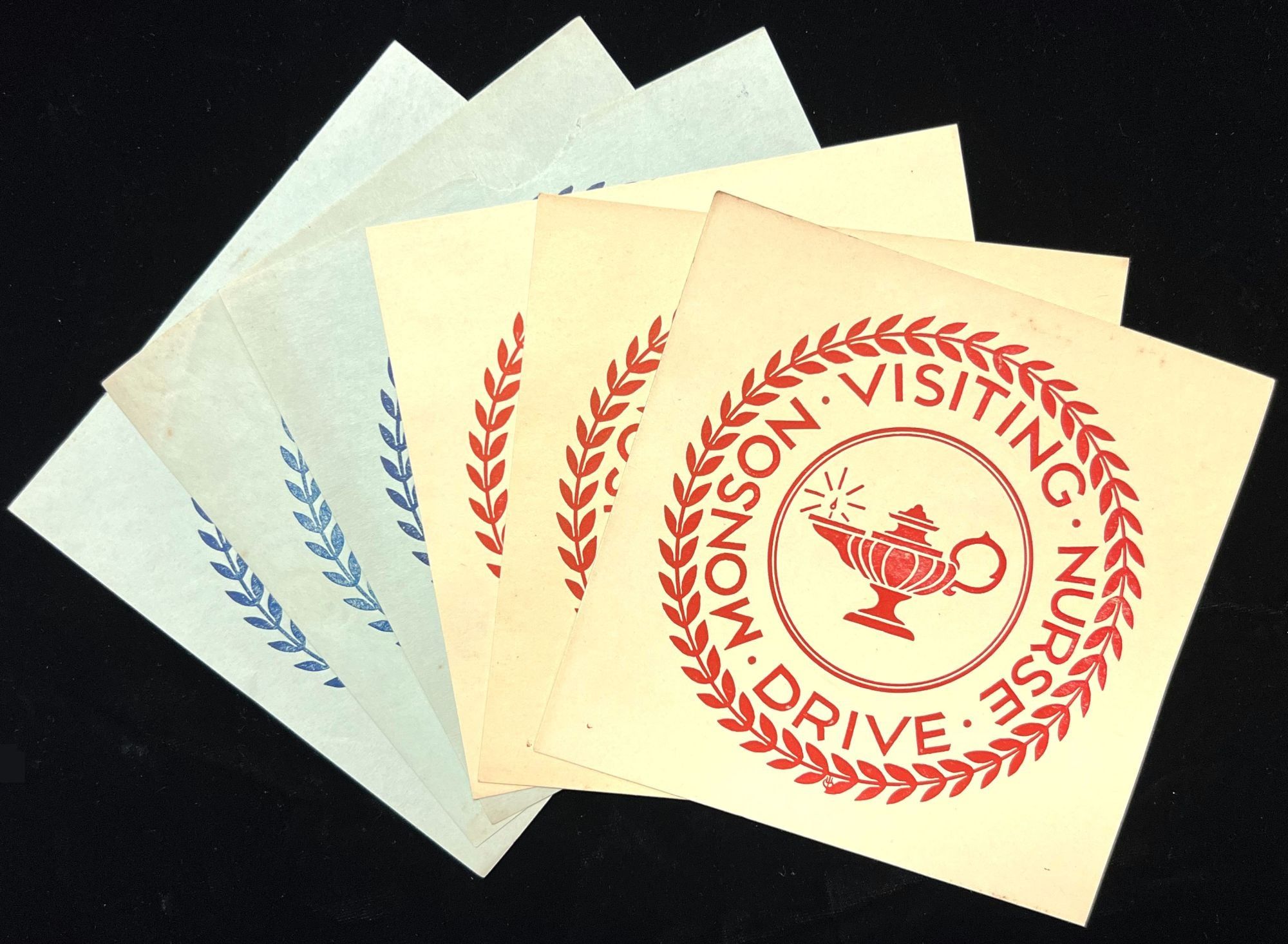 [Monson, Massachusetts], 1927. Very good. Minor dust soiling. Corners bumped, upper right- and left-hand corners torn, a couple nicks to extremities.. Support your local visiting nurse! Original poster art promoting a fundraising drive for the Monson Visiting Nurse Association. The drive took place May 9th through 16th, 1927. Original gouache artwork by Erdix Winslow Capen on thick brown card measuring approx. 22" by 16", verso blank. Accompanied by six (6) printed signs for the drive measuring 6" by 6" each, on yellow and blue paper. Erdix Winslow Capen (1909-1995) was an artist from Monson, Massachusetts. He attended the Vesper George School of Art in Boston, and eventually became stage technician at the Boston Repertory Theater, where he designed and created theatrical masks.