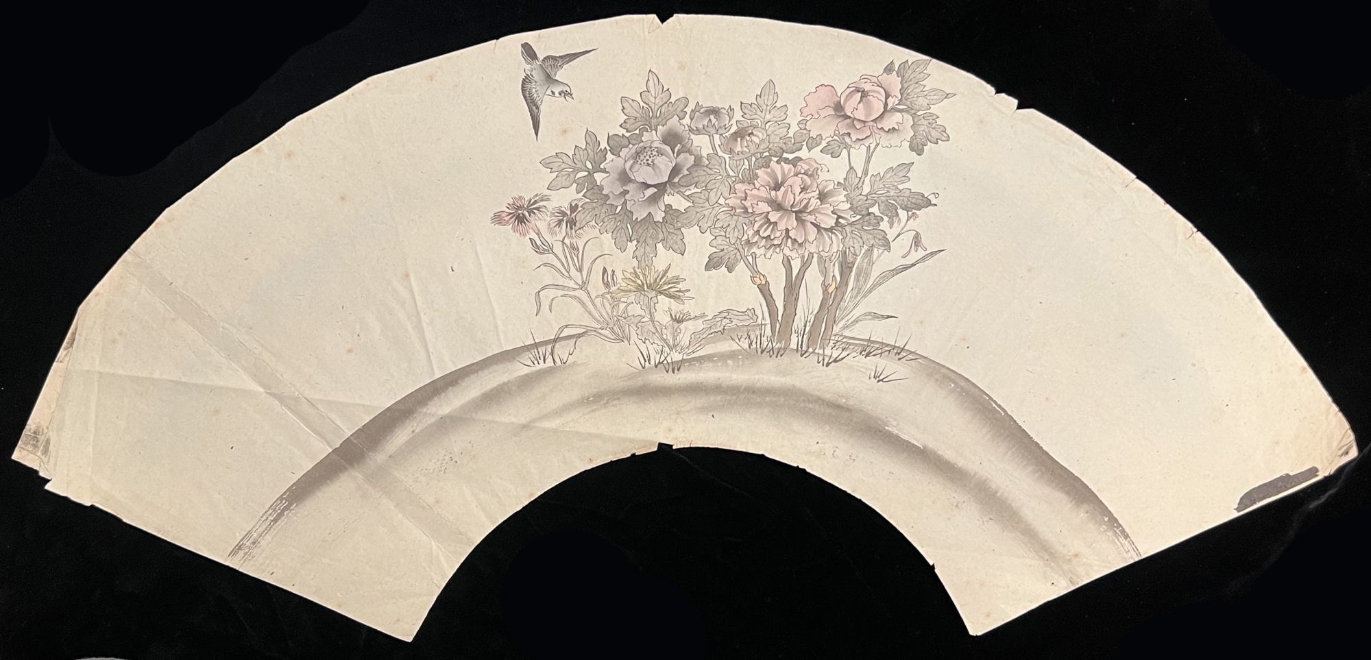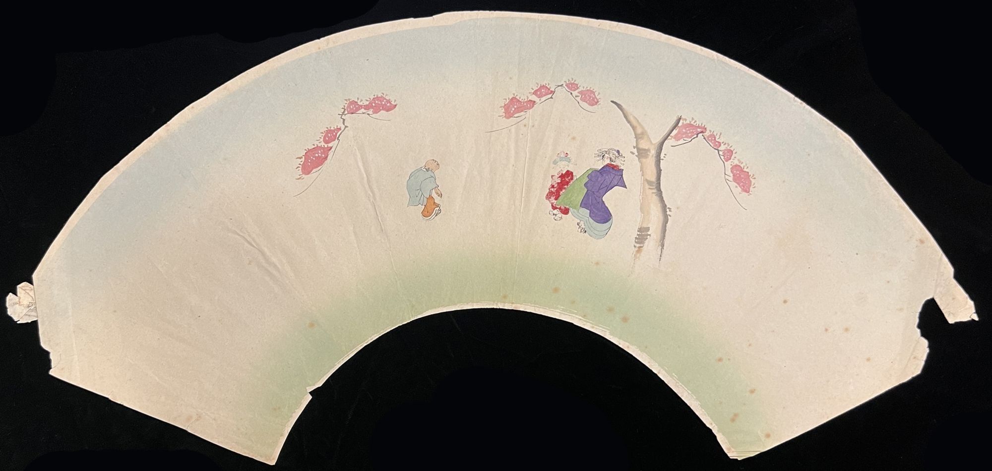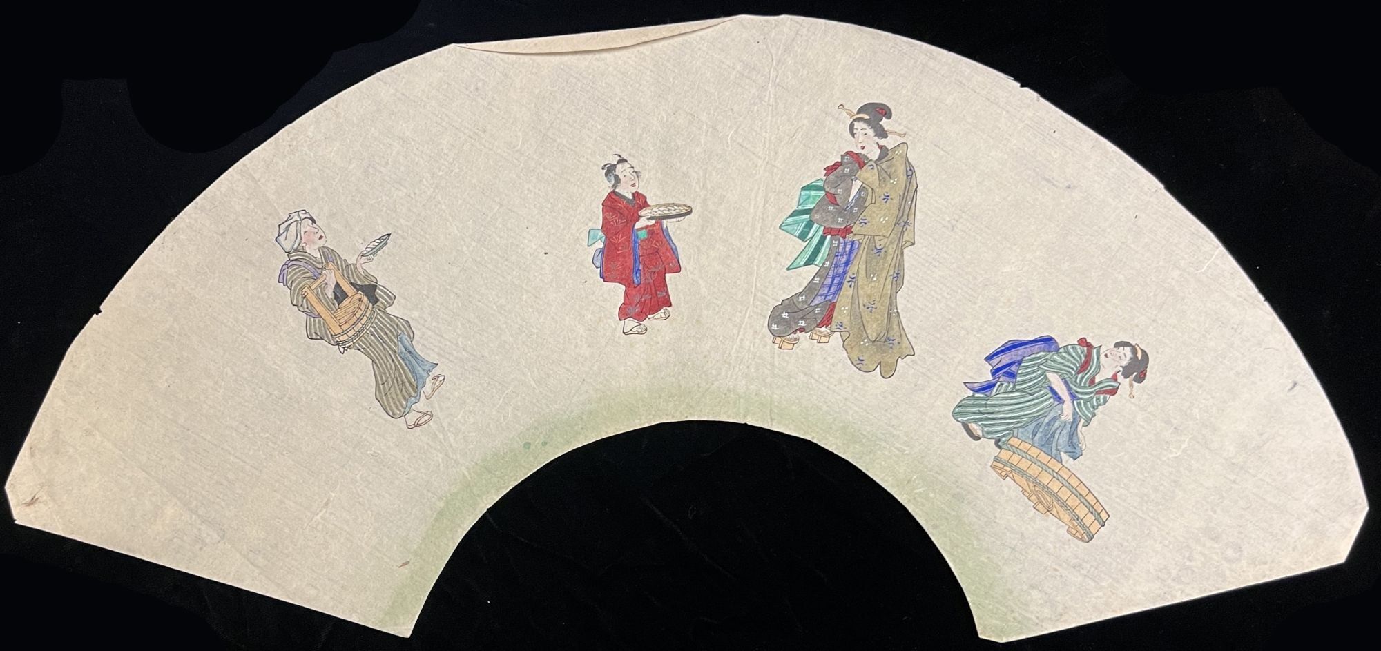 Japan, 1880. Good to very good. Minor toning, spotting, short tears. Light dust soiling.. Ten (10) Japanese Fans from the 1880s, most likely created for the tourist trade. In the late 19th century following the forced reopening of Japanese trade with the West, Western countries became intensely interested in Japanese art and culture, a phenomenon now referred to as "Japonisme". Each of the fans features either a natural motif, with flora and birds, or figures in traditional Japanese dress. It is through such objects that much of the West was introduced to aspects of Japanese culture, such as Geisha. Each fan measures approx. 6.5" by 20", and features some original artwork in ink and water color. Five (5) are original art and five (5) are hand colored and decorated with outlined images of intricate characters. One with original work on both sides. The remainder are one sided. Two (2) are signed.