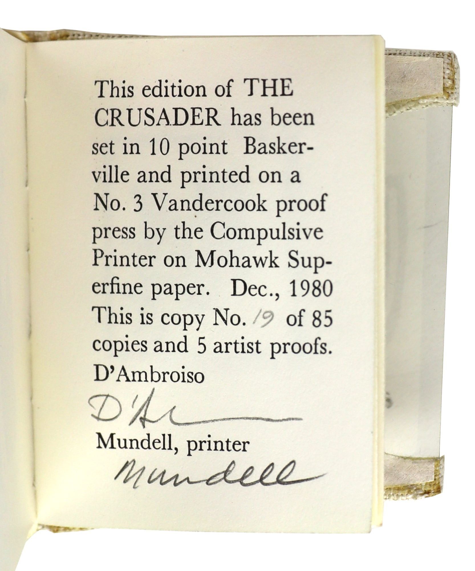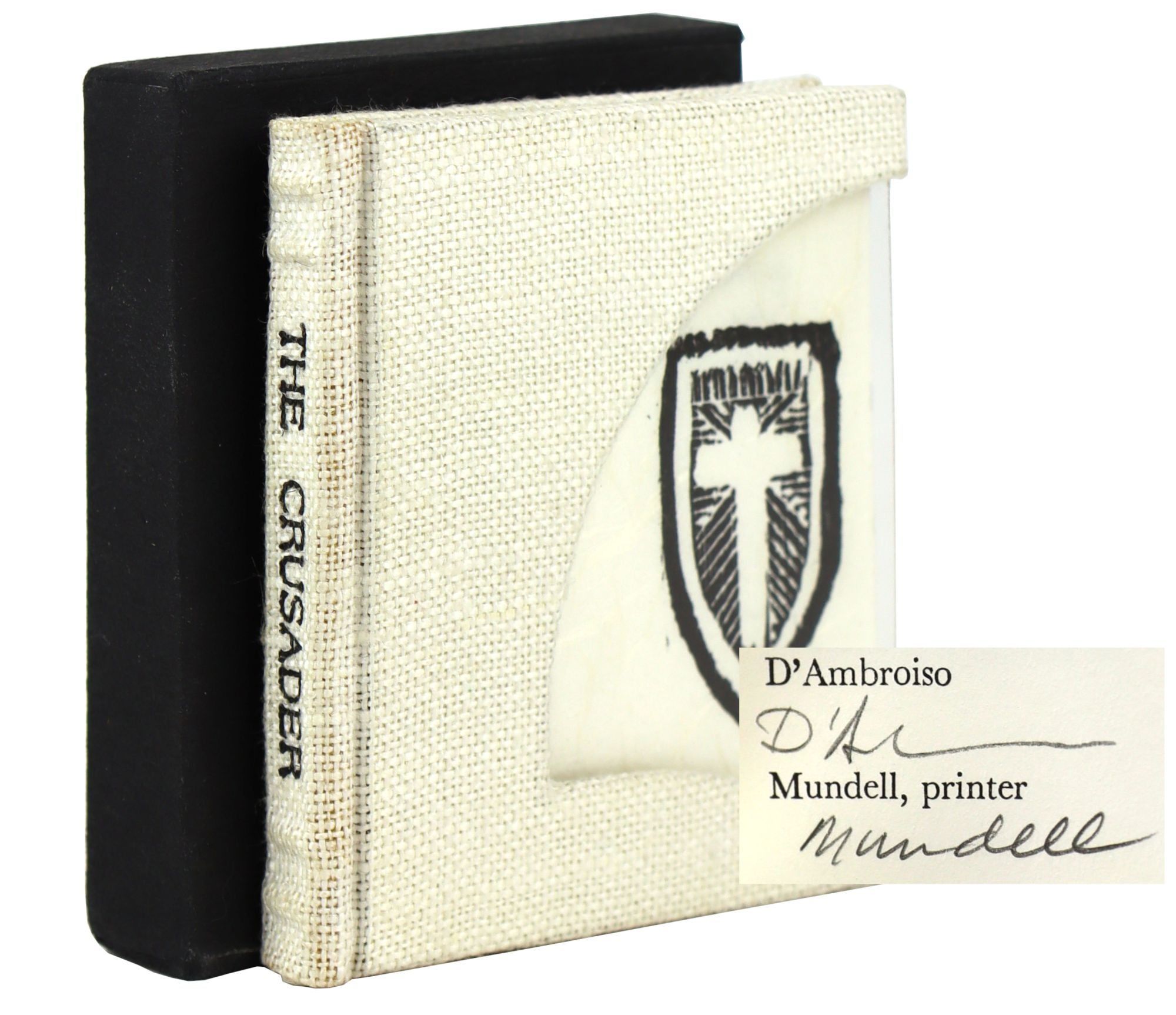 Sherman Oaks, CA: D'Ambrosio, 1980. Near Fine/Near Fine. Sherman Oaks, CA: D'Ambrosio, 1980. First Edition, limited to 85 signed copies, of which this is no. 19. Miniature book (7.5 x 6 cm); 21pp. 6 plates, 2 in red and black, all others in black, and a few in-text. Boards bound in open-weave cream cloth with black stamping to spine and cut-out windows on boards of hard plastic showing shield woodcuts on free endsheets. Some minor soiling to spine and pencil to flyleaf. Housed in black-paper wrapped slipcase with minor bumping to corners. A Near Fine copy of Dashiell Hammett's oldest daughter's short story in a Near Fine slipcase. Signed by the publisher and likely illustrator, based on the signatures, D'Ambrosio and the printer Mundell.