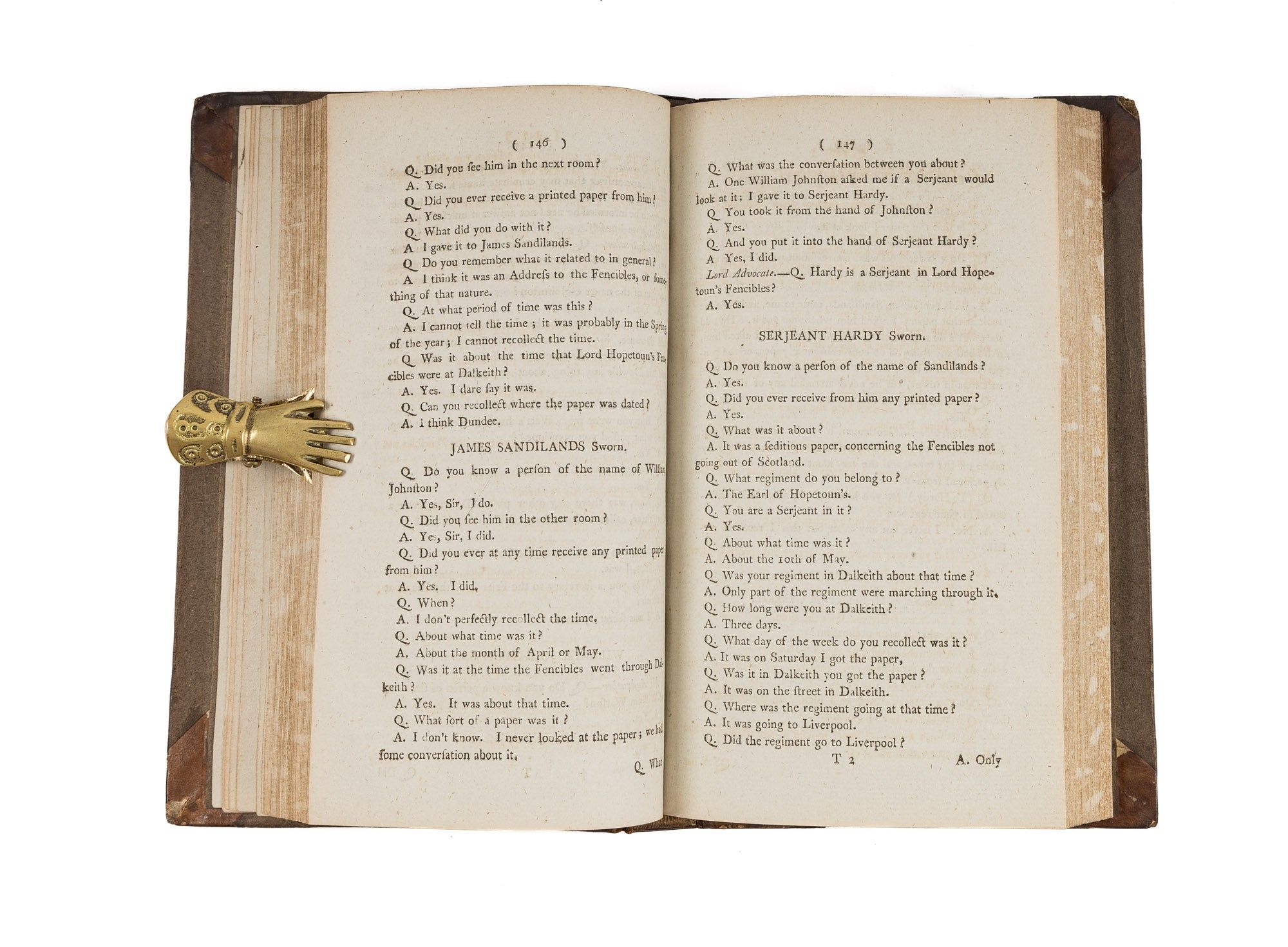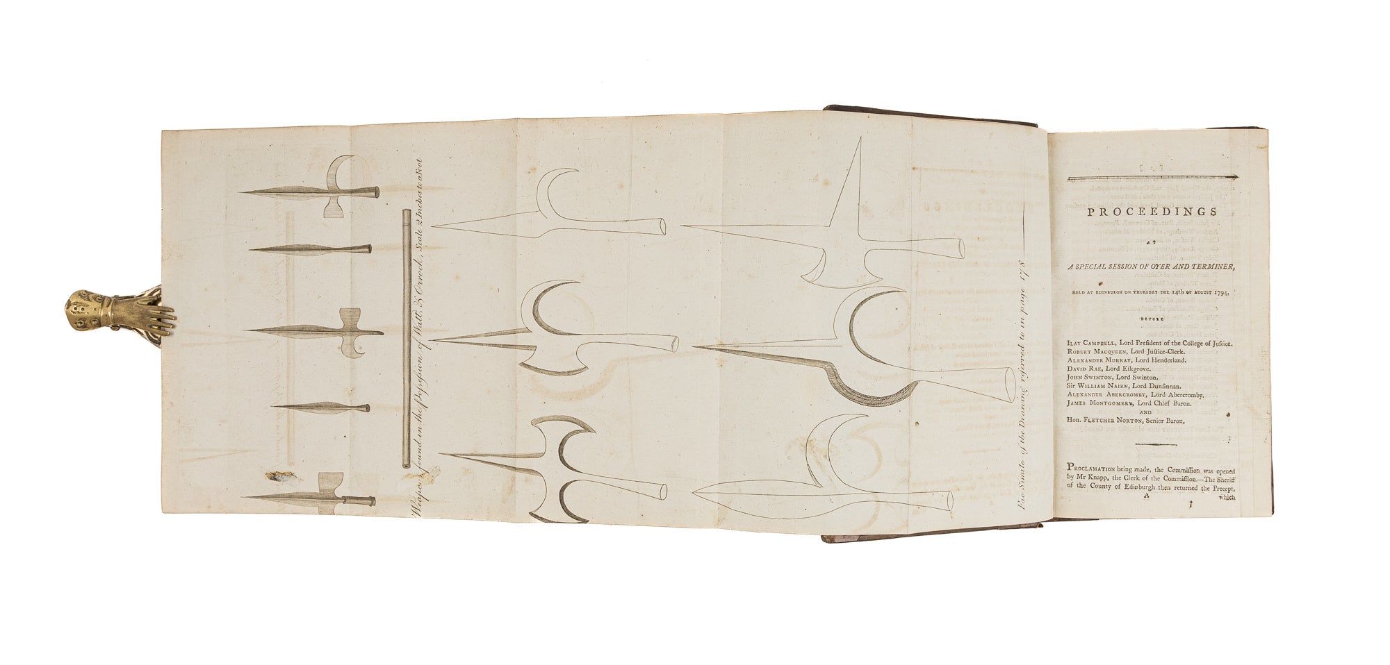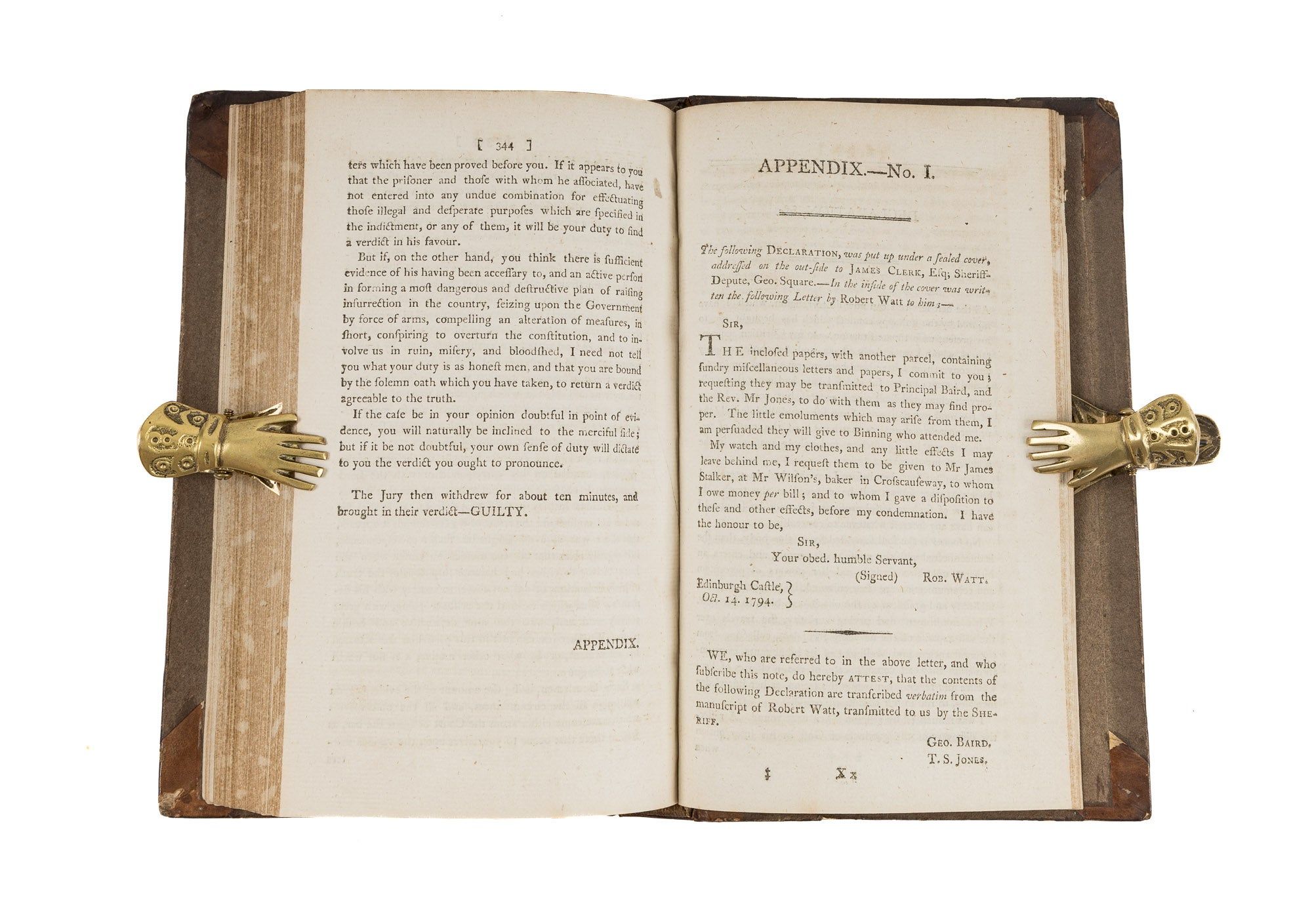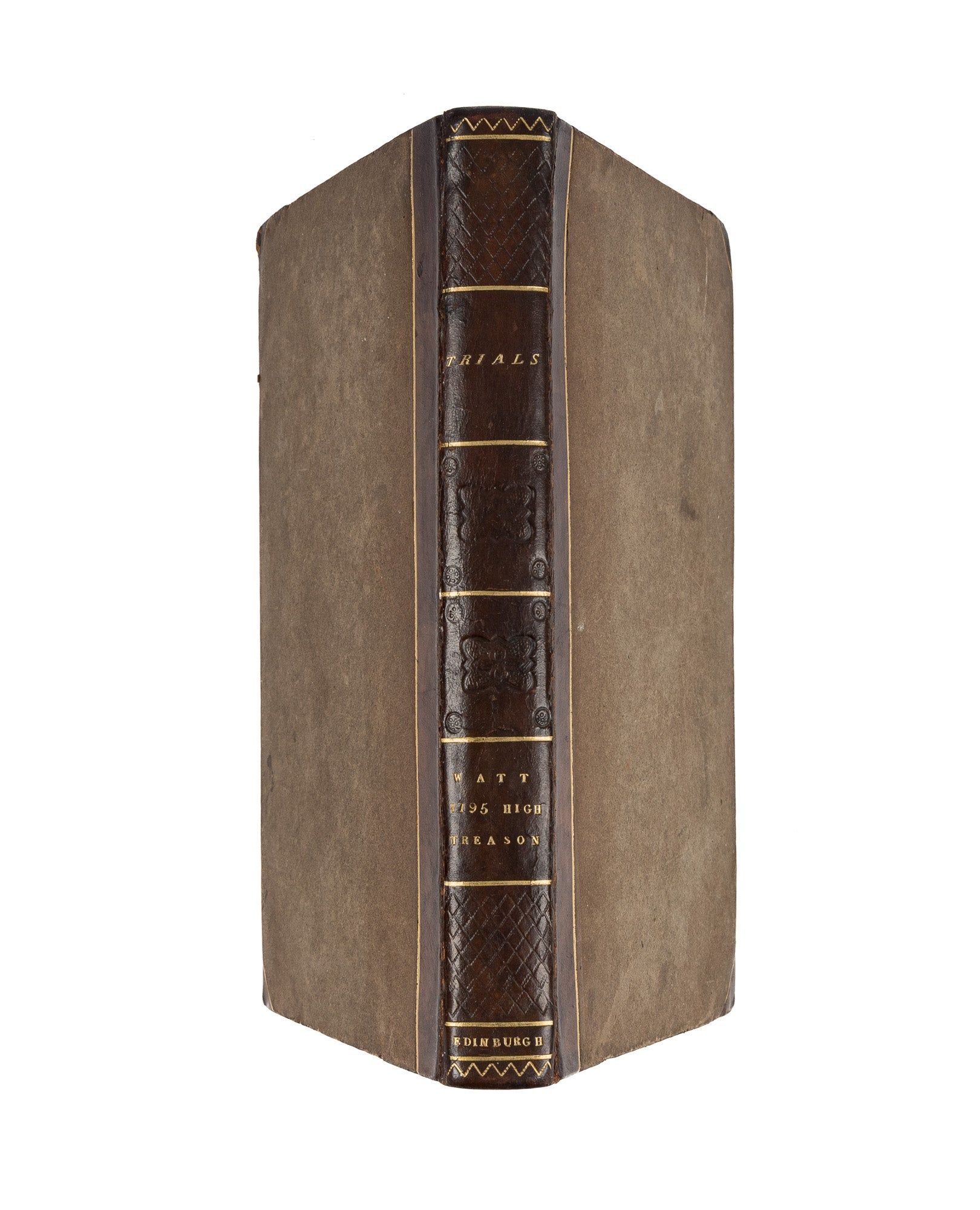 1795. Edinburgh: Printed for William Brown, 1795. Edinburgh: Printed for William Brown, 1795. An Ill-Founded Plot to Establish an Independent Scotland [Trial]. Watt, Robert [c.1761-1794], Defendant. Trial of Robert Watt, For High Treason, Before the Court, Under the Special Commission of Oyer and Terminer Held at Edinburgh. Taken in Short Hand by Mr. Blanchard, Revised by the Counsel on Both Sides, And Published with the Permission of the Court. Edinburgh: Printed for William Brown, 1795. [ii], 364 pp. Folding plate (illustrating pikes found in Watt's possession). Octavo (8" x 4-3/4"). Contemporary three-quarter calf over paper-covered boards, gilt rules to boards along calf, blind ornaments and gilt fillets and title to spine, speckled edges. Light rubbing and a few minor spots and smudges to boards, moderate rubbing to extremities, corners bumped and moderately worn. Moderate toning to interior, negligible light foxing and tiny smudges and stains to preliminaries, plate, final leaf of text and rear endleaves. A handsome copy. $450. * Only edition. Watt, a wine merchant and political radical, was the architect of a somewhat confused plot to establish Scotland as an independent country. After a search of his house turned up a number of pikes and the type for a seditious handbill, he was arrested and tried for treason. A co-conspirator was pardoned, but Watt was not so lucky. He was convicted and sentenced to be hanged and beheaded despite the jury's recommendation of mercy. The sentence reflected the court's opinion of the severity of Watt's crime. It was also intended to be a warning to other radicals. English Short-Title Catalogue N013806.