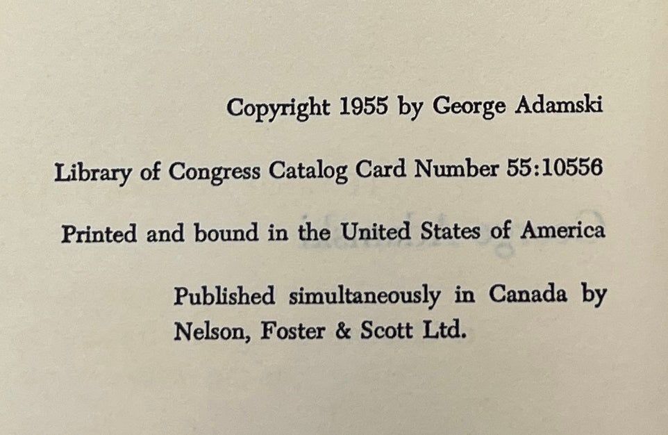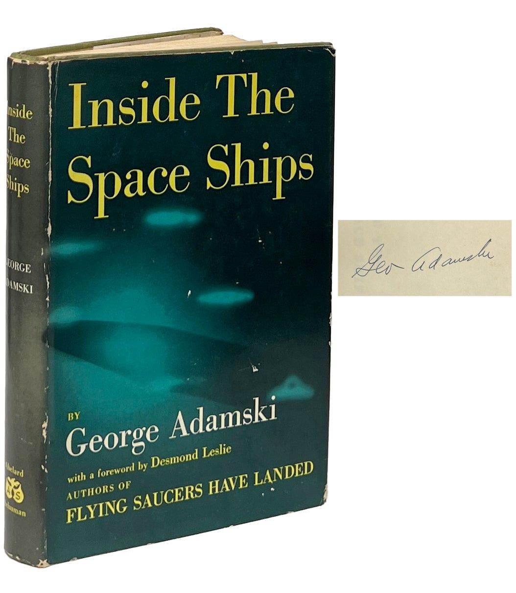 New York: Abelard-Schuman, Inc, 1955. First Edition. Hardcover. Very Good/Very Good. Foreword by Desmond Leslie. Signed by Adamski on the front endpaper. Very Good in a Very Good jacket, unclipped ($3.50), generally toned and soiled, rubbed at the edges and with some creases and scuffs. Green boards, soiled and toned at the edges, with dark green ink lettering on the spine. Square and firmly bound, foxed at the edges and endpapers, clean internally. Adamski's account of his experiences after the publishing of his work Flying Saucers Have Landed? From the collection of ufologist Tom Benson.