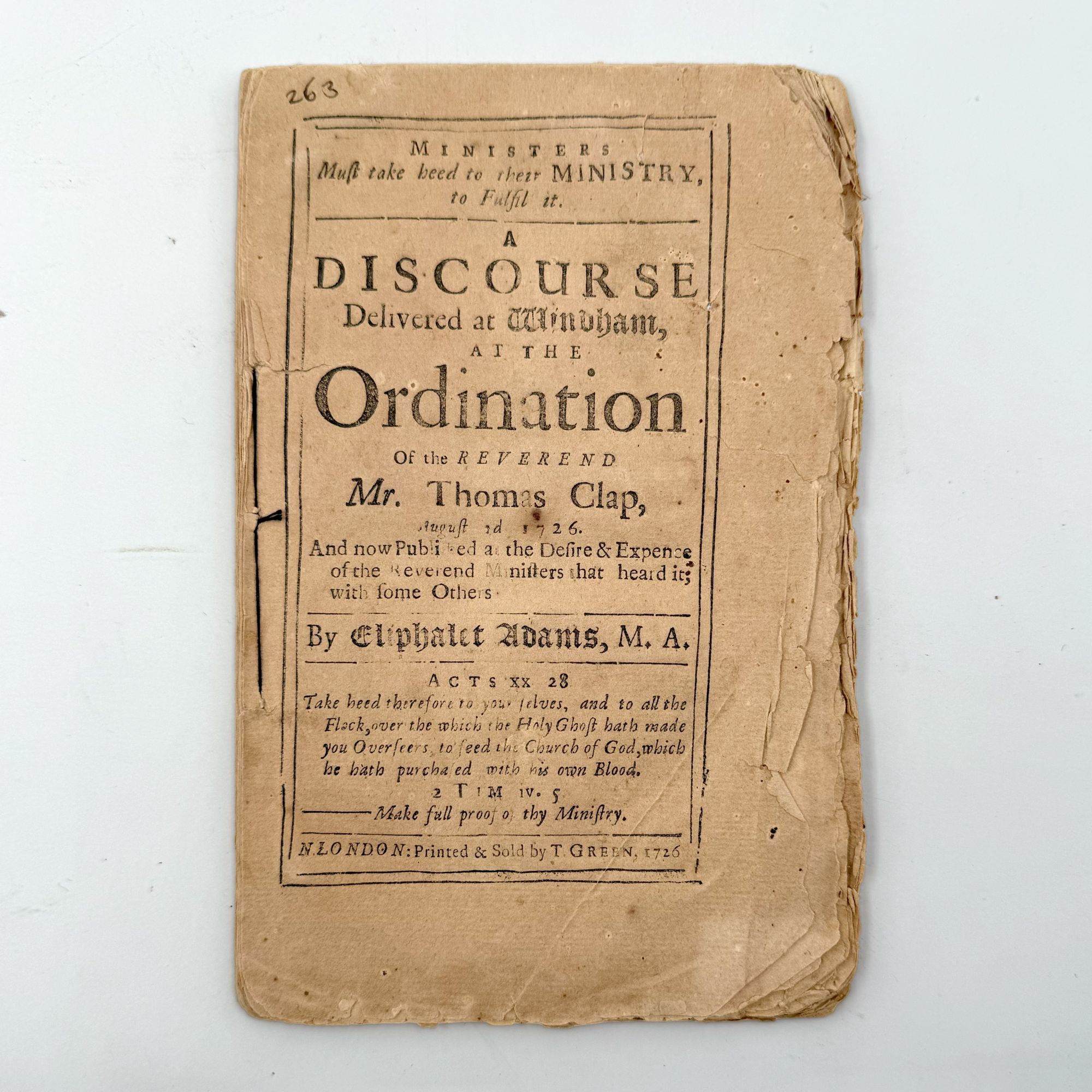 New London: Printed and Sold by T. Green, 1726. [4], 50, [2] pp. Uncut. 8vo. Self-wrappers, restitched. Toned, minor staining, minor tears. [4], 50, [2] pp. Uncut. 8vo. Evans 2723; Trumbull 14; ESTC W26191
