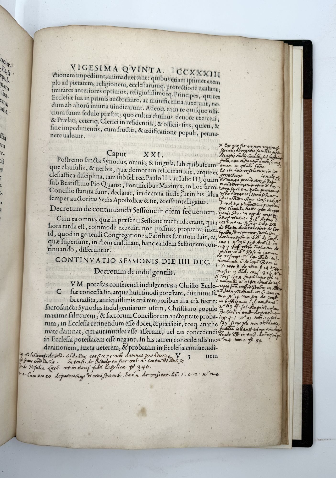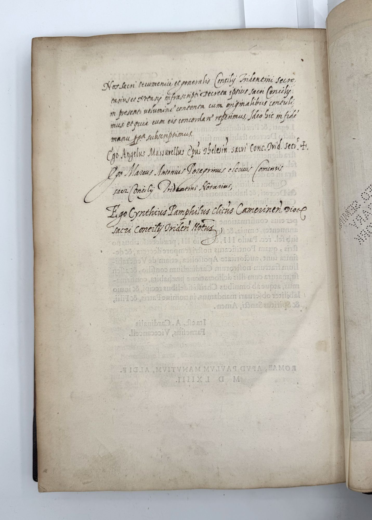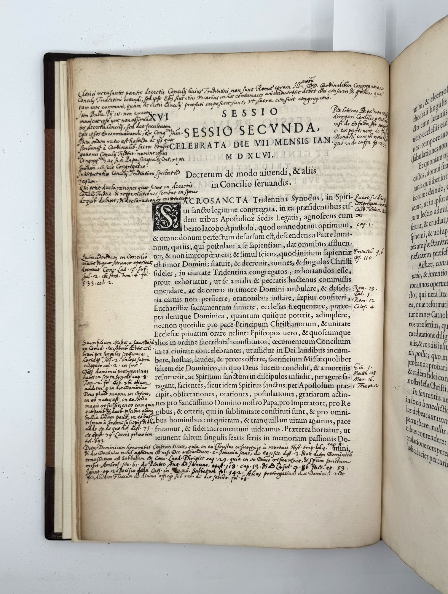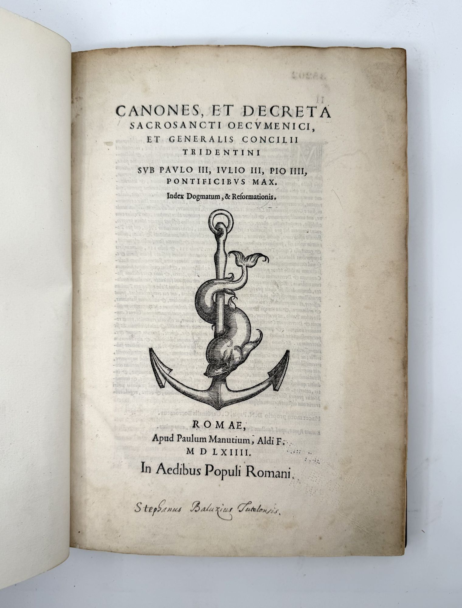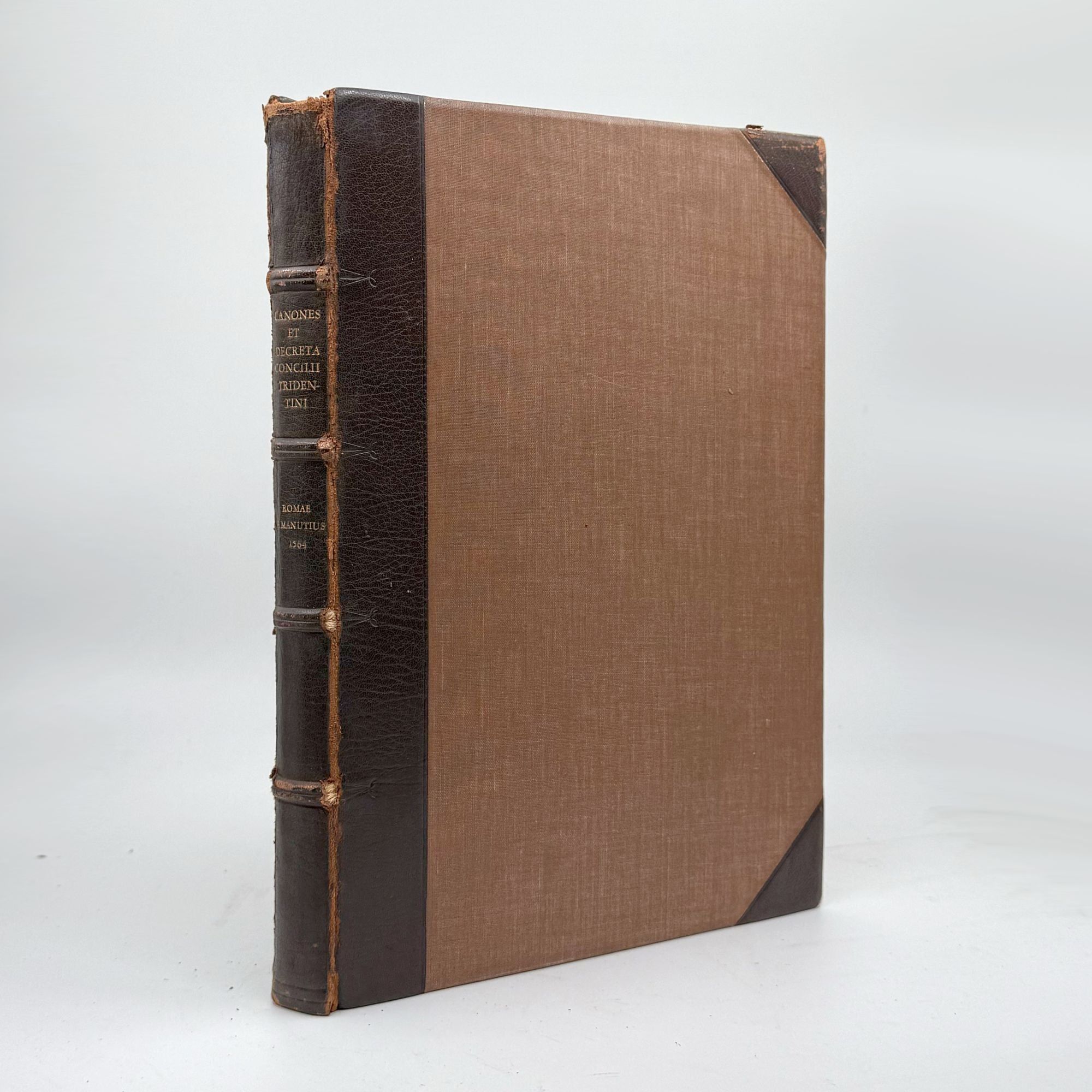 Rome: Apud Paulum Manutium, Aldi F., 1564. Second folio ed. of the Canons and decrees of the Council of Trent. Printer’s device on title page. Extra-illustrated with a folding plate bound between text and index. 239, [13] pp. 1 vols. Folio. Half brown morocco and cloth. Joints rubbed. Plate with repairs along lower fold. Second folio ed. of the Canons and decrees of the Council of Trent. Printer’s device on title page. Extra-illustrated with a folding plate bound between text and index. 239, [13] pp. 1 vols. Folio. An attested copy of the Canons and decrees of the Council of Trent. On the verso of p.CCXXIX (leaf V6), as a further certification of authenticity, a handwritten statement, with signatures of Angelus Massarellus, secretary of the Council, Marcus Antonius Peregrinus and Cynthius Pamphilus, both notaries at the Council. These copies were presumably inscribed and attested before they left the publishing house, and were destined for dignitaries. Renouard believed (p. 191) that few existed (he supposed 12 or 30).