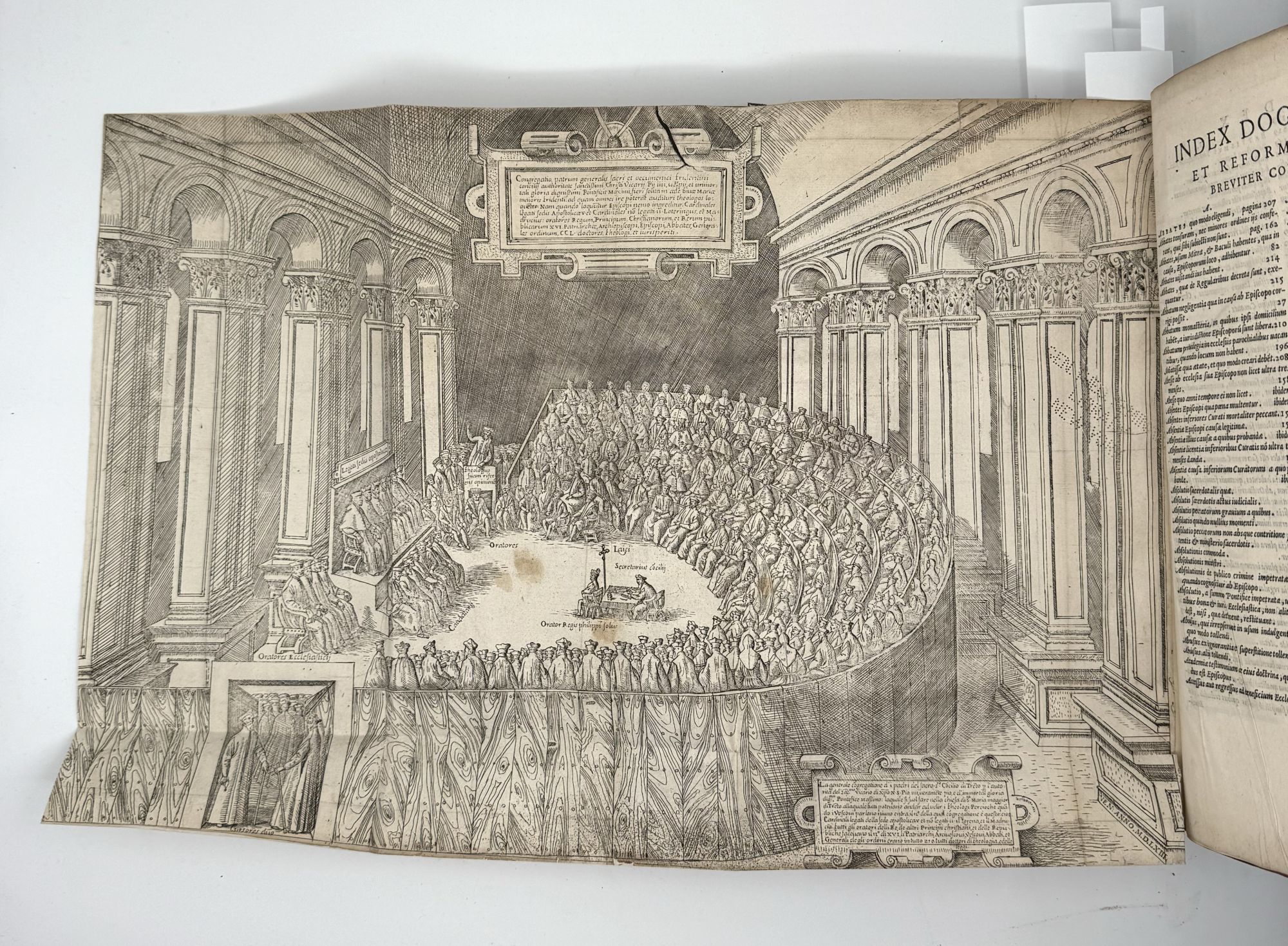 Inserted between leaves V6 and X1 is a large folded engraving of the Council in session (329 x 494 mm) with title: Congregatio patrum generalis sacri et occumenici Tridentini Concilii ... = La generale co[n]gregatione d[e]i padri del sacro s[an]to Co[n]cilio di Tre[n]to ...; with imprint: Ven: Anno. M.D.LXIII. [1563].