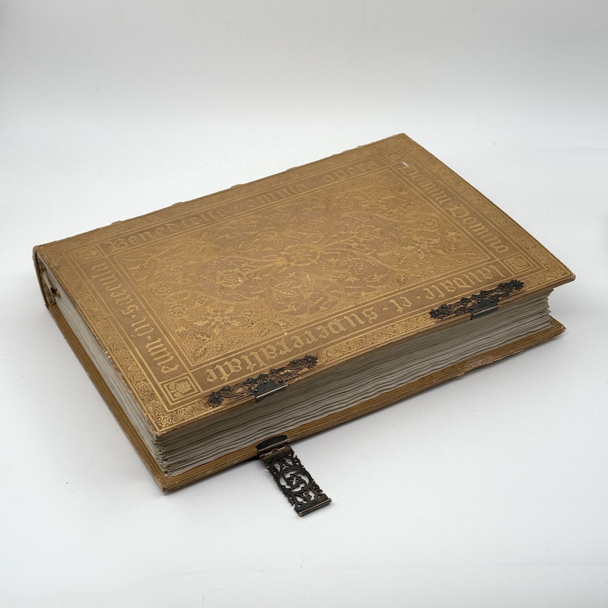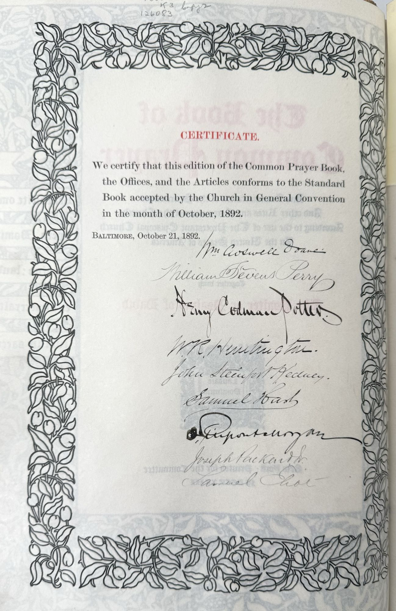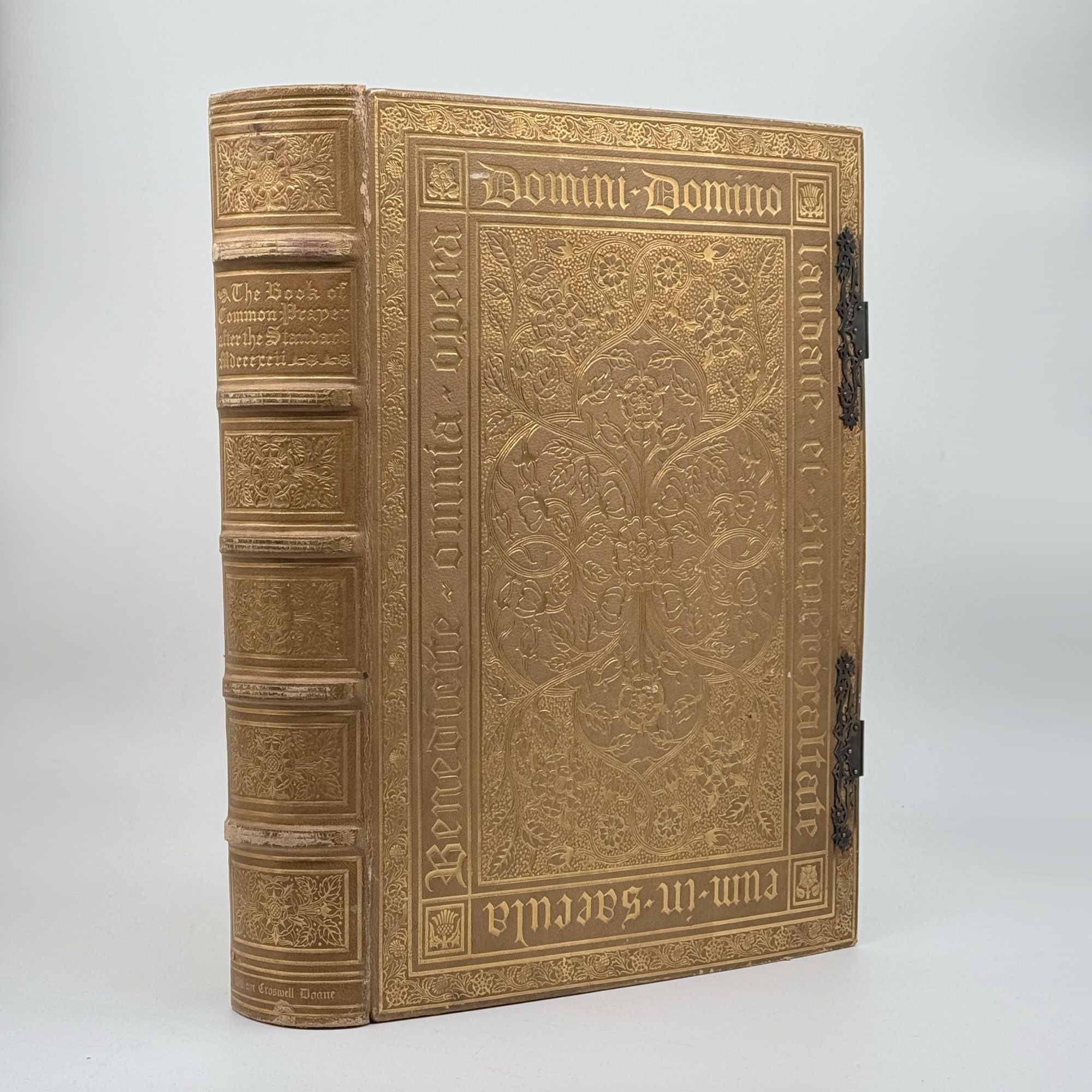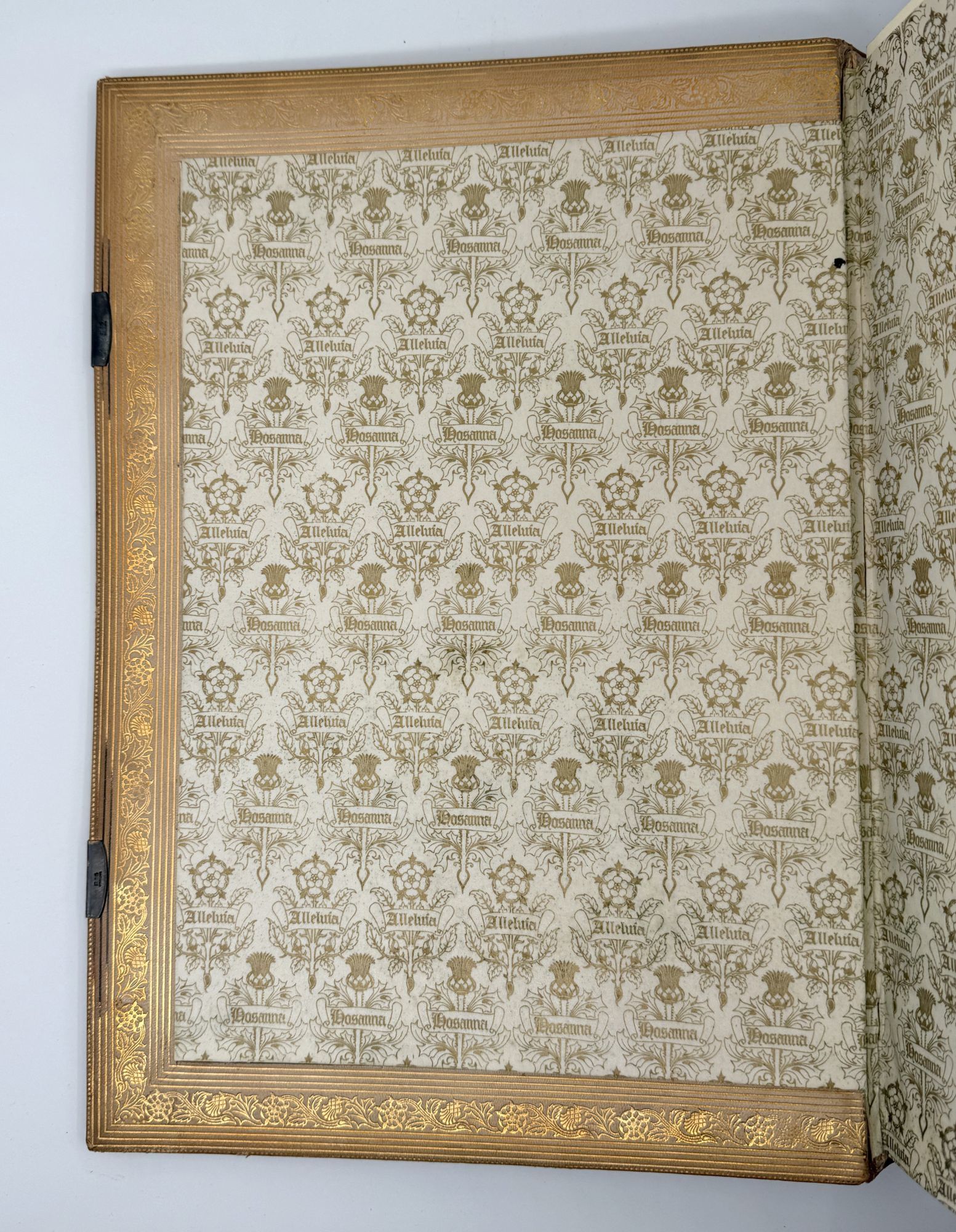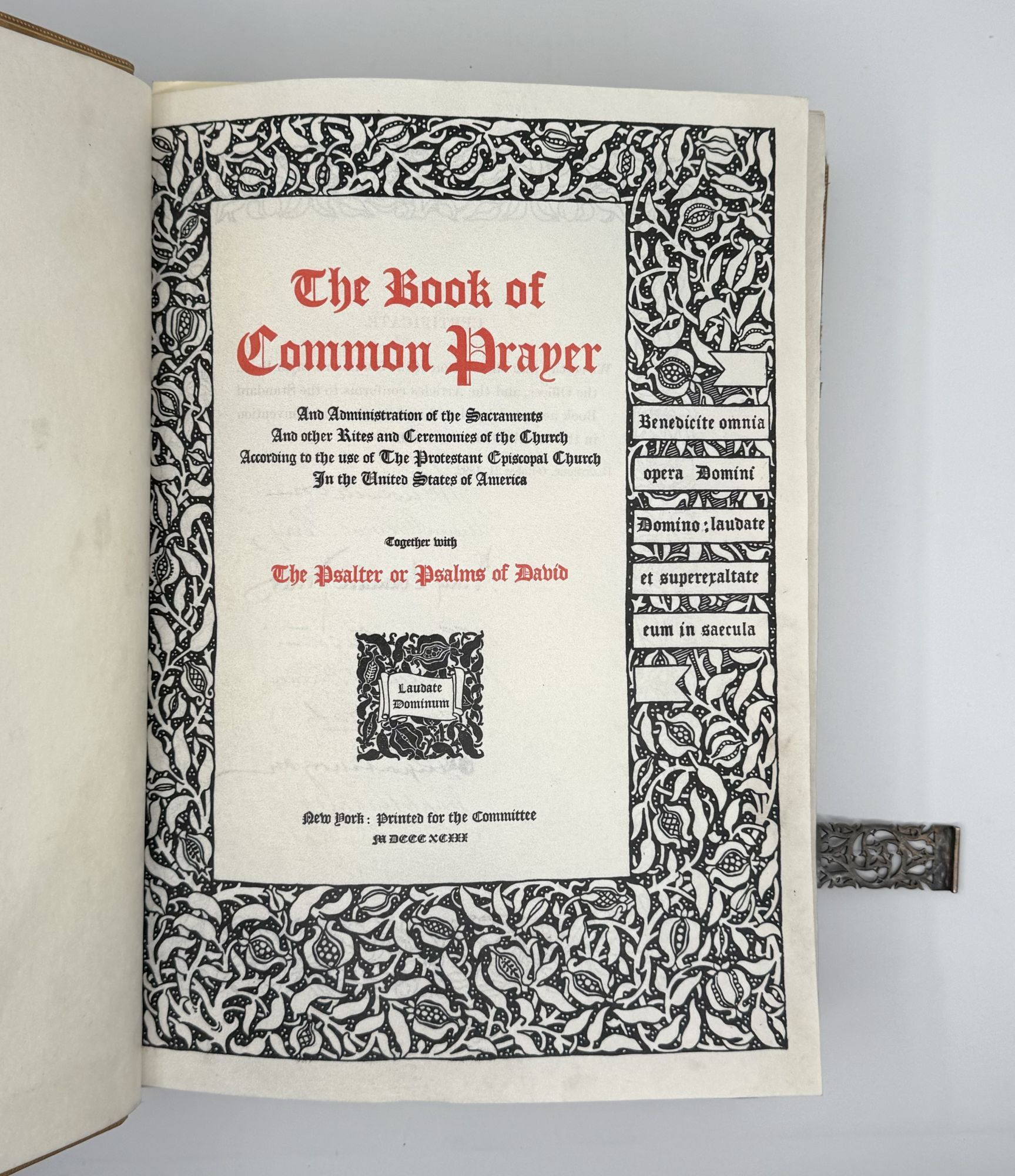 New York: Printed for the Convention, 1893. One of 11 copies printed on pure vellum. Signed by J.Pierpont Morgan and others. [28], 566, [2] pp. Title printed in red and black, with floriated borders by Bertram Grosvenor Goodhue, title in black letter. 1 vols. Folio. Bound in publisher's full tan morocco, with elaborate gilt design and wih metal clasps, one of 2 missing. In crimson dropbox. One of 11 copies printed on pure vellum. Signed by J.Pierpont Morgan and others. [28], 566, [2] pp. Title printed in red and black, with floriated borders by Bertram Grosvenor Goodhue, title in black letter. 1 vols. Folio. The vellum copies were given as gifts to the members of the Committee on Revision of the Prayer Book. Griffths 1893; Updike, Notes on the Merrymouth Press & Its Work, p. 9; John Clyde Osborn, Catalogue of Work of The De Vinne Press Exhibited at the Grolier Club, p. 15; Tichenor, The Life of Theodore De Vinne pp. 128-131; Hutner, 102; Smith 713; Gewirtz, But One Use, 96