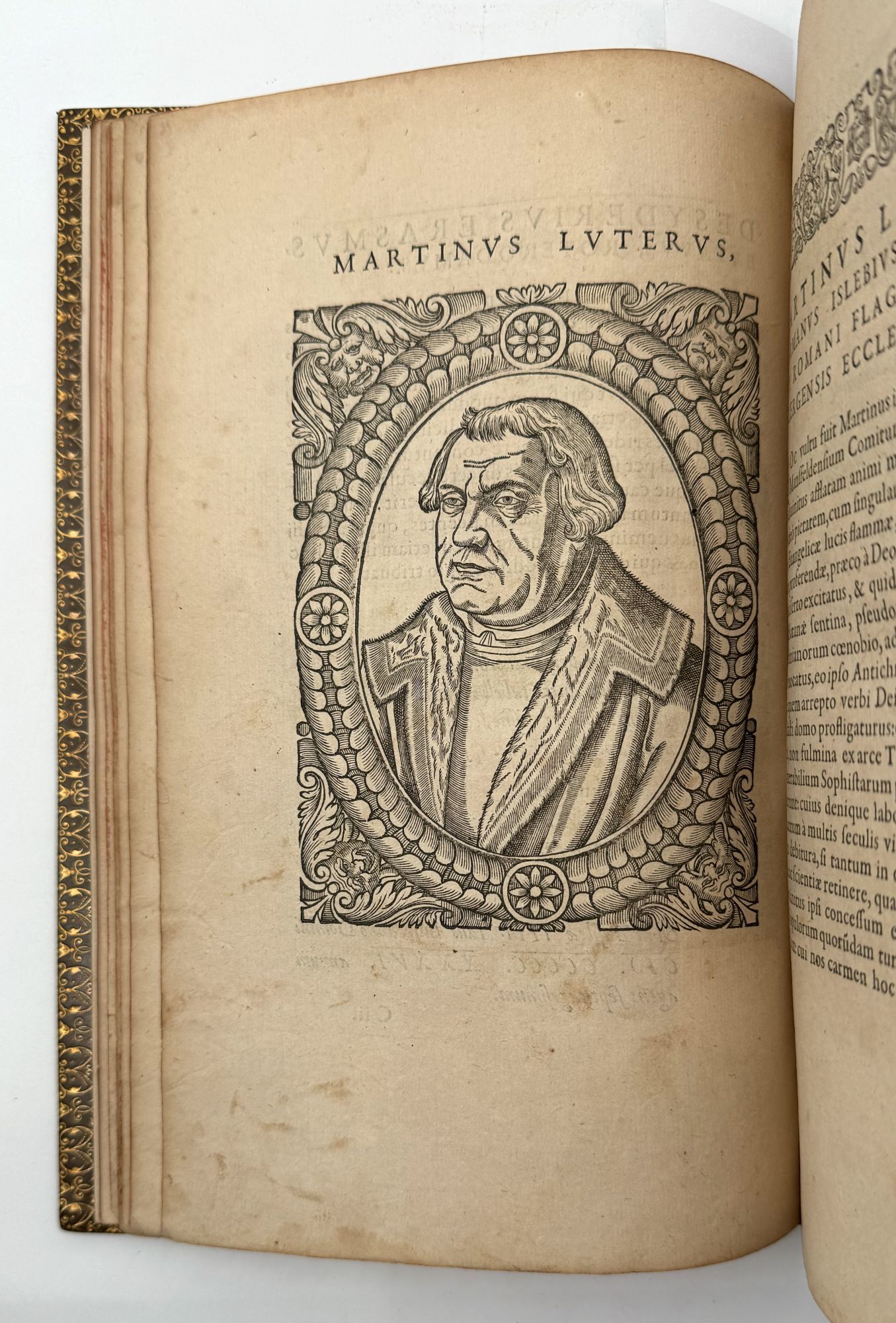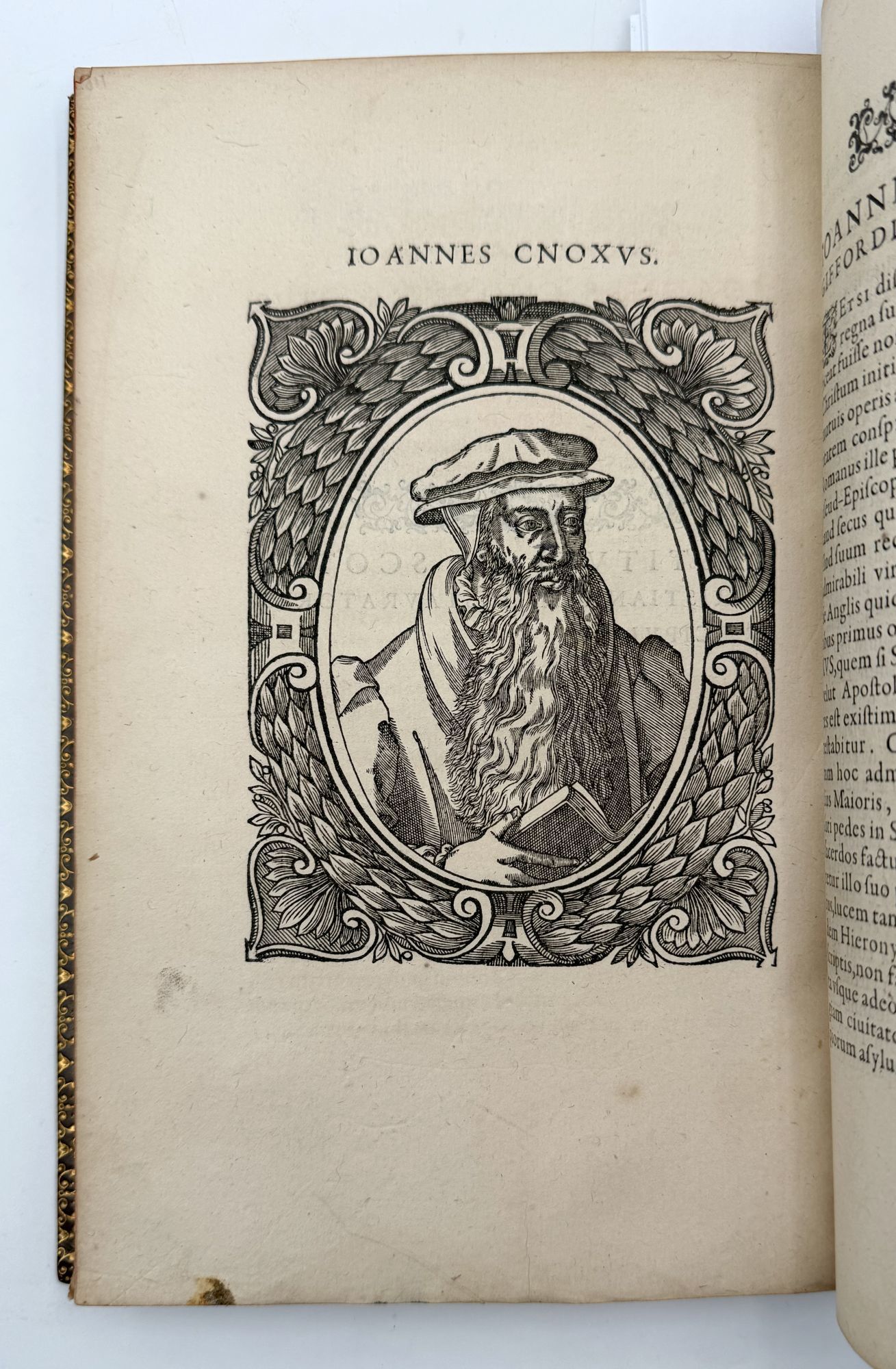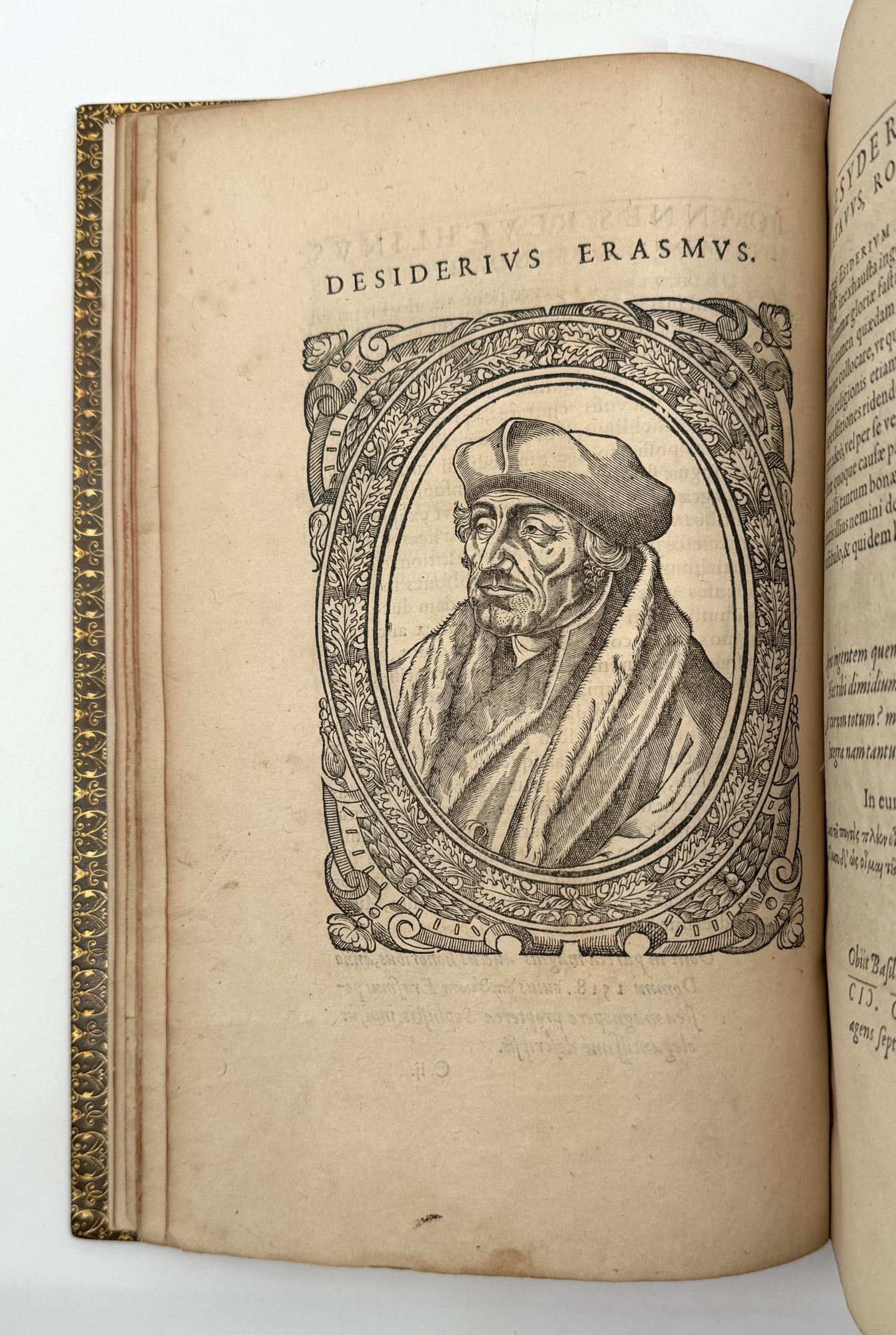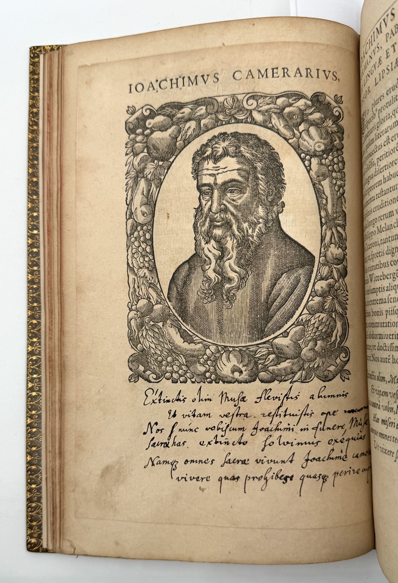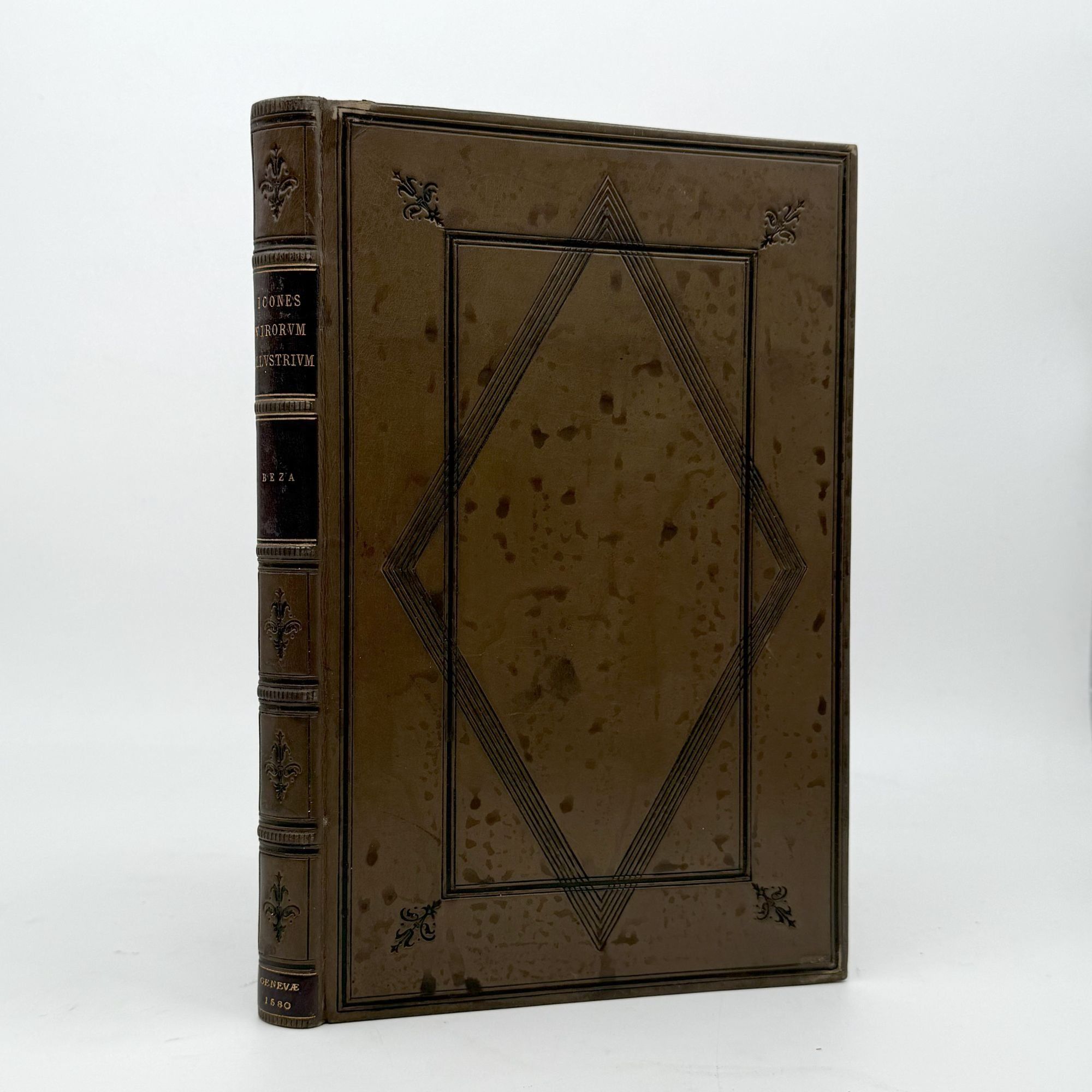 Geneva: Jean de Laon, 1580. First edition. With 38 fine woodcut portraits and 44 numbered Emblems; title page vignette, ornamental scrollwork borders, numerous headpieces. Collation: *4 A-2Q4 (-2Q4 blank). Leaf E4 supplied from another copy (trimmed). 1 vols. 4to (9-5/8 x 6-1/8 inches). Full brown antique calf blocked in blind and in black, board edges and turn-ins gilt, marbled endleaves, edges red, by Alfred Matthews. Fine copy in dark green pull-off case (worn). First edition. With 38 fine woodcut portraits and 44 numbered Emblems; title page vignette, ornamental scrollwork borders, numerous headpieces. Collation: *4 A-2Q4 (-2Q4 blank). Leaf E4 supplied from another copy (trimmed). 1 vols. 4to (9-5/8 x 6-1/8 inches). A famous and interesting illustrated book from the Reformation, with portraits and short biographies of Erasmus, Luther, Calvin, Savonarola, Zwingli, Melanchthon, Cranmer, John Knox, John Huss, and many others, including the young James VI of Scotland (to whom the book is dedicated). The series of Emblems is equally notable. In his Bibliographical Decameron, Dibdin writes extensively on the “delicacy of execution” of the emblems and the apparent fidelity of the portraits (reproducing an emblem and the portrait of James VI).