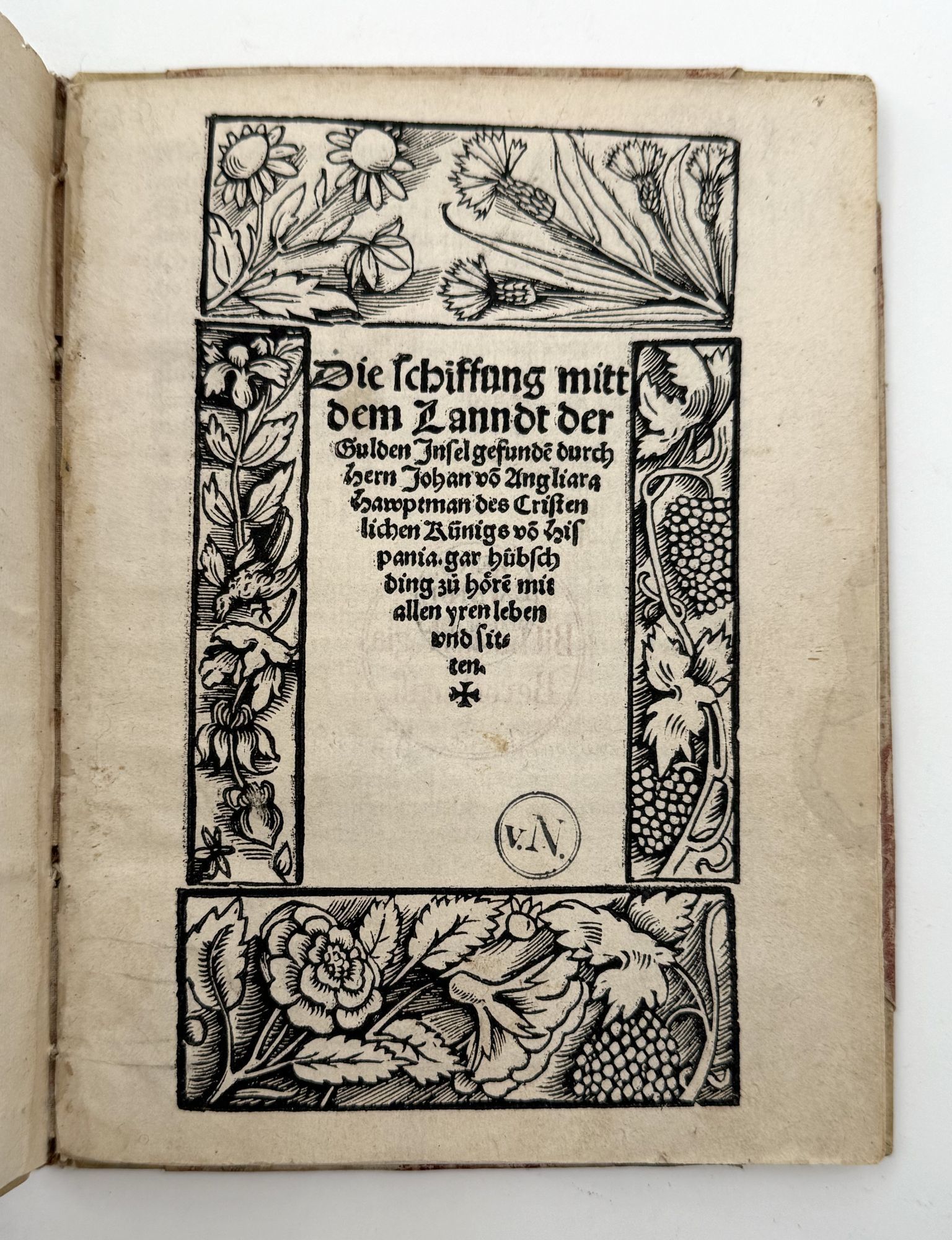 [Augsburg: J. Nadler, 1520. [3] leaves. Titlepage with floral woodcut border in four sections. 4to. 19th-century three quarter vellum and marbled boards. In a cloth chemise and half morocco and cloth slipcase, spine gilt. Minor stains, repair to fore-edge of title. Very good. Provenance: Beroltinenti Library (stamp on verso of title, with later withdrawal stamp). [3] leaves. Titlepage with floral woodcut border in four sections. 4to. The first and only German edition of a tract ostensibly describing discovery of new lands in the New World. Of the author, wholly unknown to most bibliographers, Harrisse suggests that Peter Martyr was intended given the similarity of his Anghiera to the stated author’s “Angliara.”
