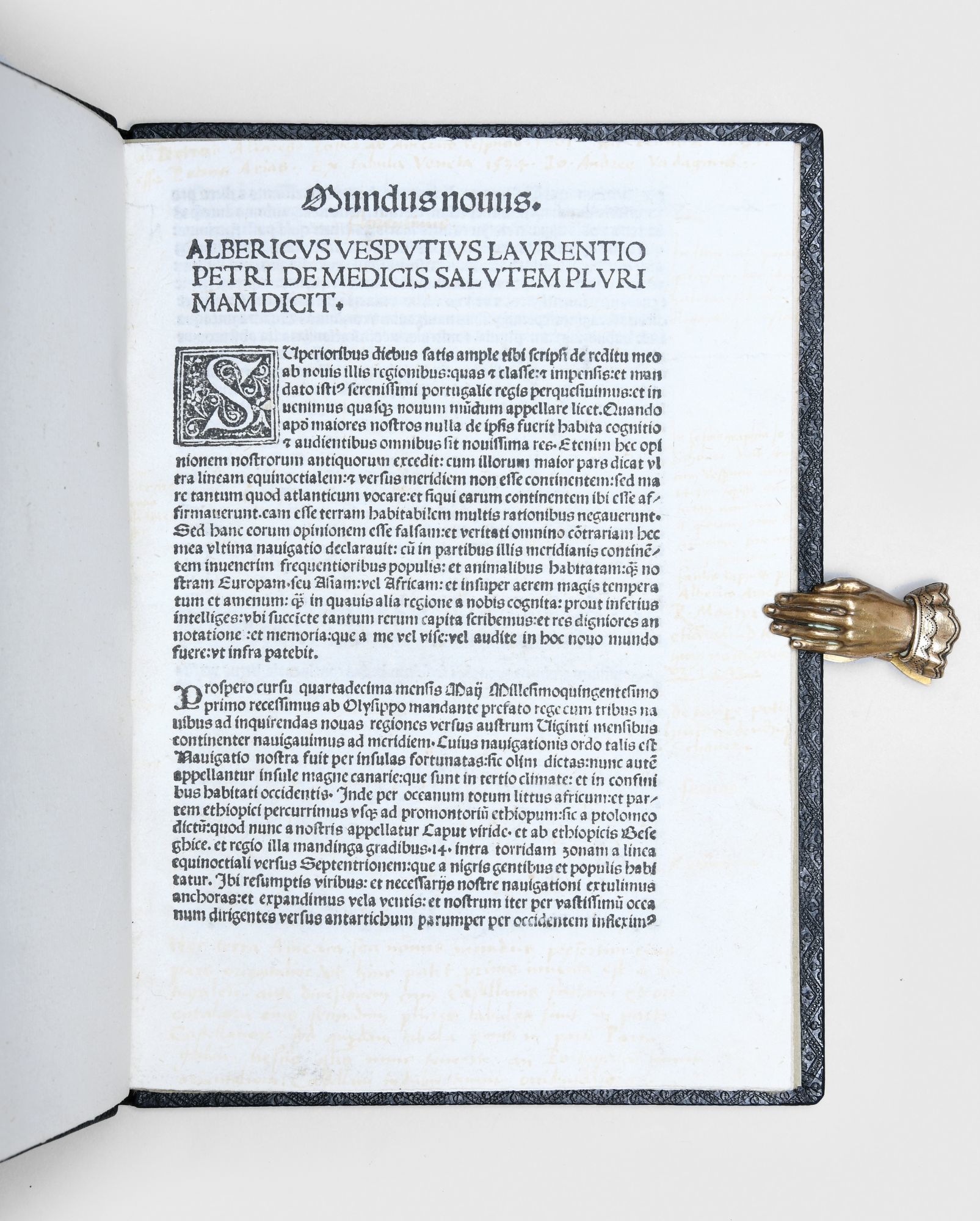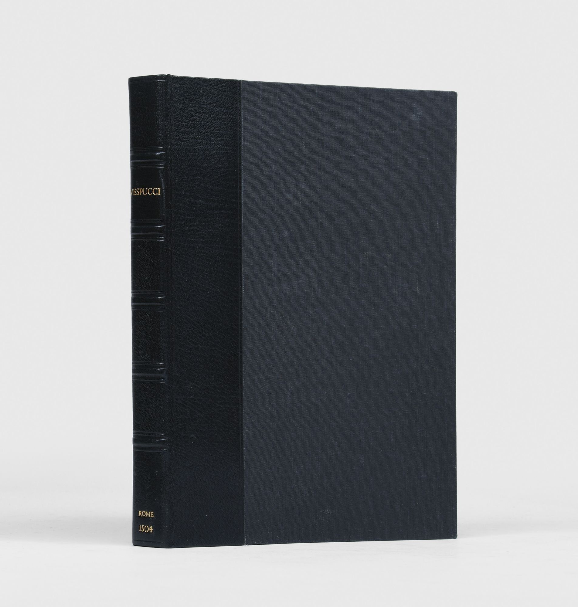 Rome: Eucharius Silber, 1504. [4] leaves. 2 woodcut initials & 2 schematic representations of constellations and a woodcut diagram. Extensive near contemporary marginalia, significantly faded (see below). 4to. Bound in modern black crushed morocco, ruled in blind, spine with raised bands. In a half morocco and cloth clamshell case, spine gilt. Washed. First letter mis-inked in "[c]ognitione" on recto of leaf A2. [4] leaves. 2 woodcut initials & 2 schematic representations of constellations and a woodcut diagram. Extensive near contemporary marginalia, significantly faded (see below). 4to. A primary account of the discovery of the New World, indeed the first to describe it as such, Mundus Novus is the first printed account of Brazil, and Vespucci's first published work about his American voyages.