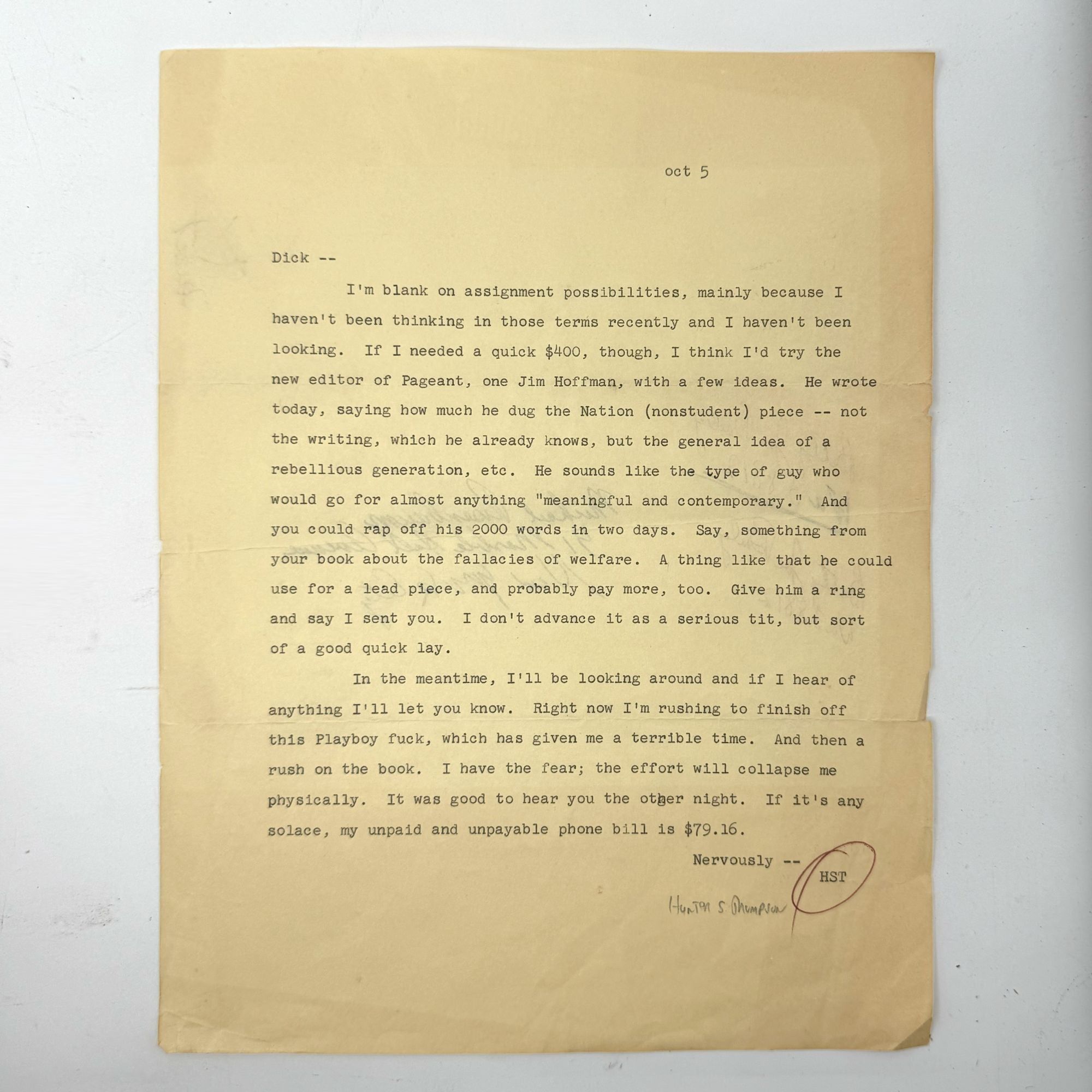 In part: “If I needed a quick $400, though, I think I’d try the new editor at Pageant, one Jim Hoffman, with a few ideas. He wrote today, saying how much he dug the Nation (nonstudent) piece — not the writing, which he already knows, but the general idea of a rebellious generation, etc. He sounds like the type of guy who would go for almost anything ‘meaningful and contemporary.’ And you could rap off his 2000 words in two days. Say something from your book on welfare. […] I don’t advance it as a serious tit, but sort of a good quick lay. […] Right now I’m rushing to finish off this Playboy fuck, which has given me a terrible time. And then a rush on the book. I have the fear the effort will collapse me completely […] my unpaid and unpayable phone bill is $79.16.”