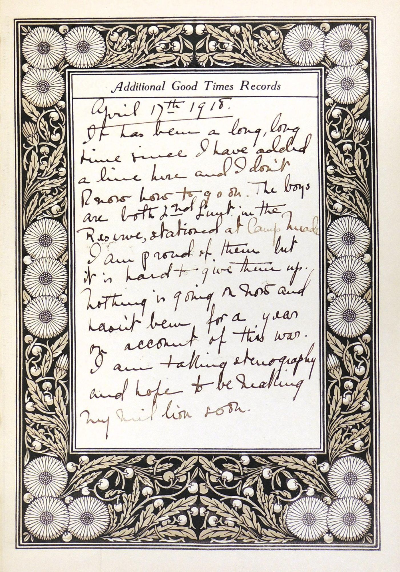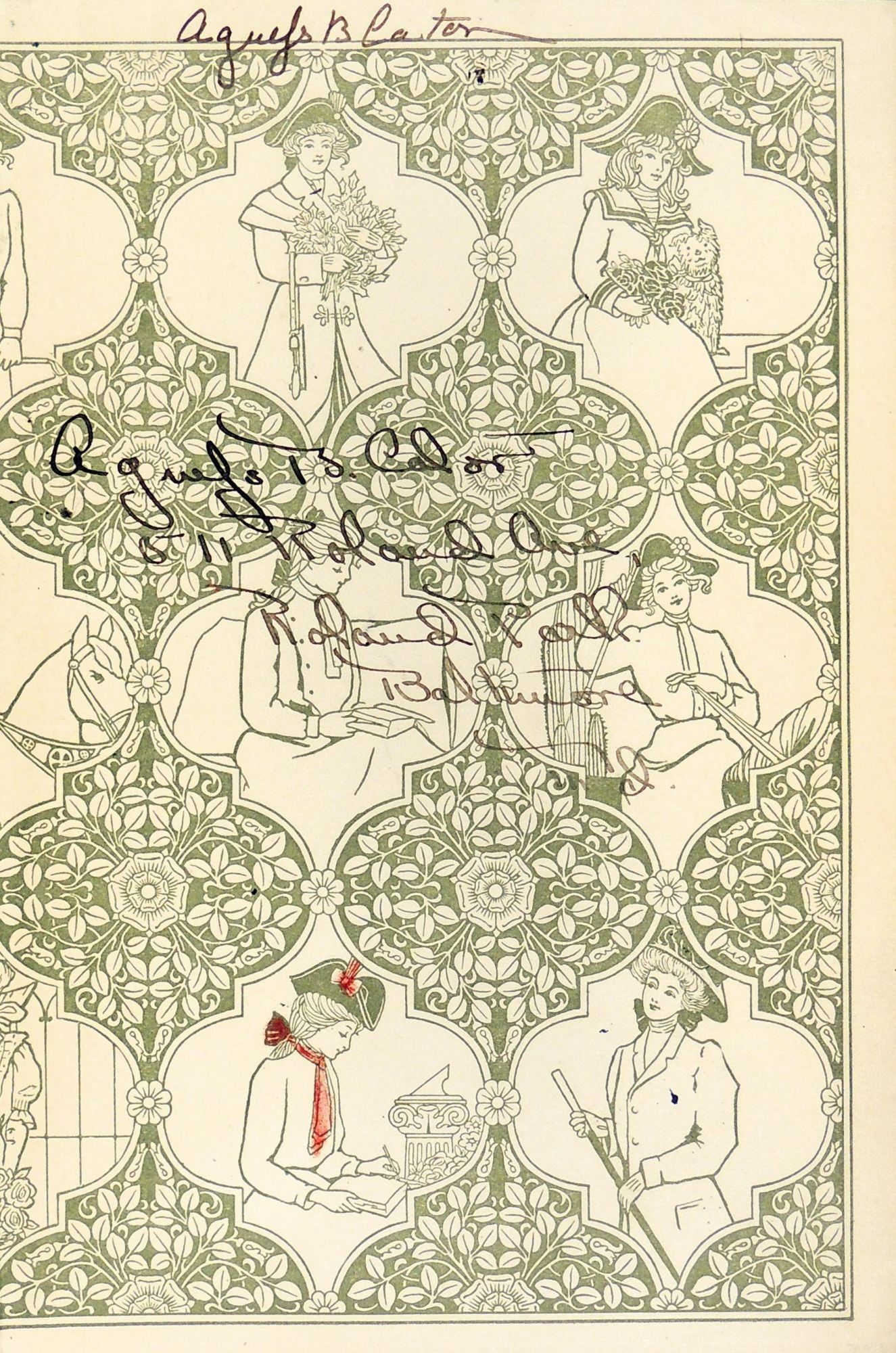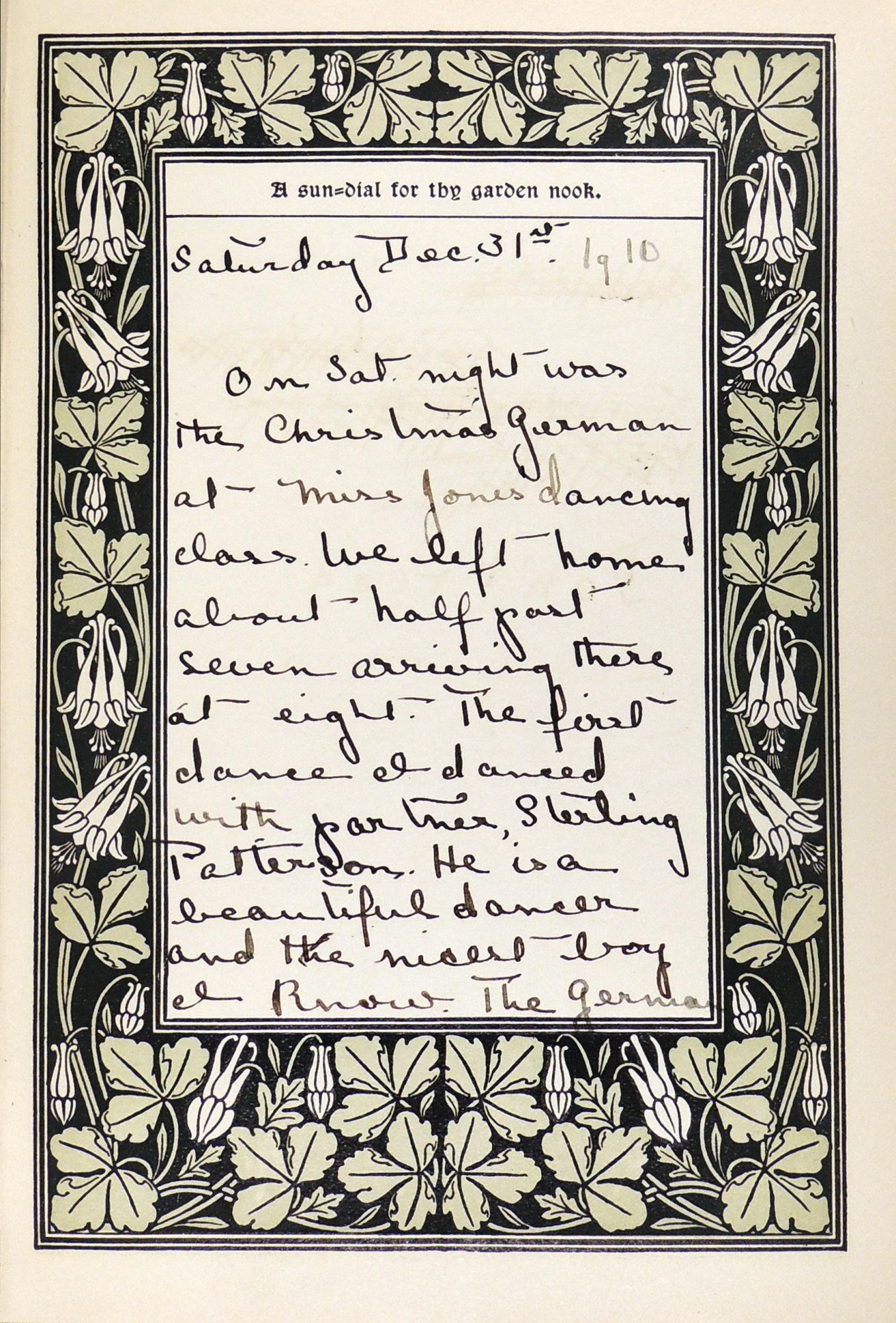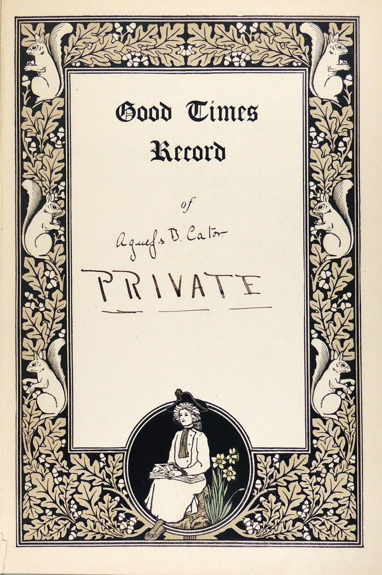 This good times book offers a diary format for young girls and women to keep their diary and to note birthdays of friends and relatives. The owner of this diary writes her name on the title page of the record as what appears to be Agnes B. Caton. There was an Agnes B. Caton who was born in 1898 and died in Rockville in 1982 so one might suppose she was the keeper for this diary that records the owner's entries from 1910-1920 written in ink and occasionally pencil There is also an ownership signature on the free front endpaper with a Baltimore address. It appears that the owner was a teen age girl when this begins. It is mainly a record of social engagements, seeing friends, and a great deal about boys! She also writes of going to school, church, and downtown shopping expeditions. She records her activities in great detail for the first few years but entries are more sporadic in later years. In fact, the last entry, dated April 5,1920 was written two years after the previous one, and talks of her engagement to Jack Fulton and how he wants to wait until his business is established before they marry. The diary ends here. A few of the earlier entries written while WWI was taking place mention that various male friends were in the military, often overseas.