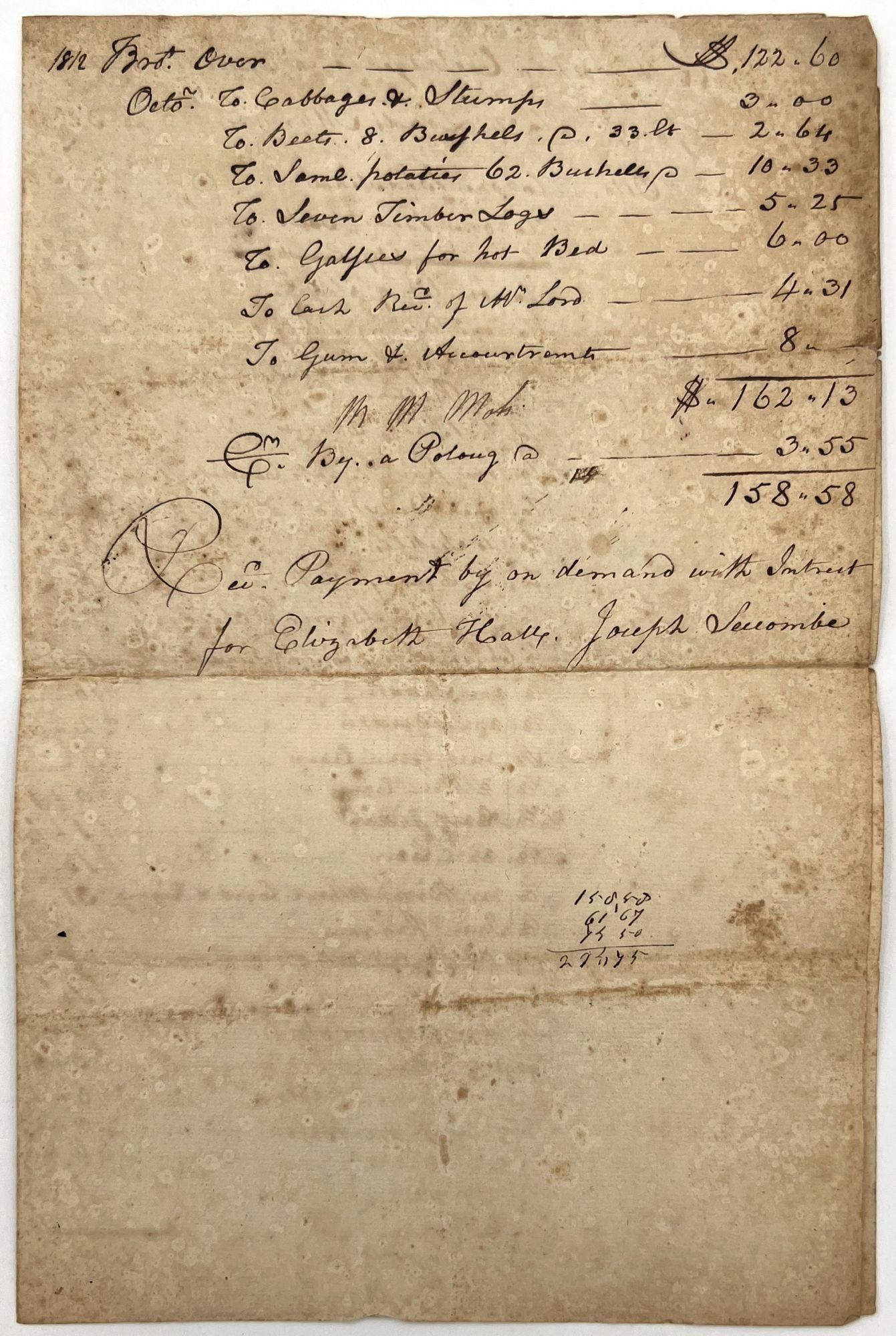Boston, Massachusetts, 1812. Good. Toned with spotting, dust soiling, a couple short tears.. Fair copy manuscript inventory and appraisal of items purchased by Elizabeth Hall from the estate of Mr. Joshua Coolidge of Boston. Valued at $122.60, roughly $2,909.26 today, it includes the following: "2 Loads Manure", "one bedstead", "5 Pictures", "2 hen coops", "one cow", and other items necessary for running a farmstead. Ink manuscript on blank bifolium (11.5" by 7").