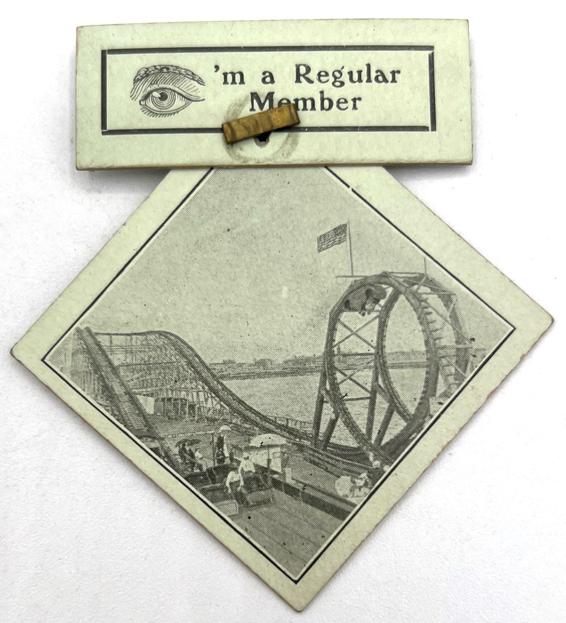 Atlantic City, New Jersey: Young's Million Dollar Pier, 1903. Very good. Light dust soiling.. A fun novelty badge produced in 1903 for lovers of the "Loop the Loop", a.k.a. the "Flip Flap Railway", in Atlantic City, New Jersey. An early example of the roller coaster, it was designed and built in 1901 by Edward A. Green and Edwin Prescott for Atlantic City's "Young's Million Dollar Pier". There are two components to the badge, secured together with a brass grommet. The front features a photo of the coaster, with a rebus message reading "[Eye]'m a Regular Member"; the back reads, "of Flip Flap Meets Every Day on Young's Pier Atlantic City Initiated 1903". The coaster closed in 1912. Badge measures approx. 3" by 3" including both components.