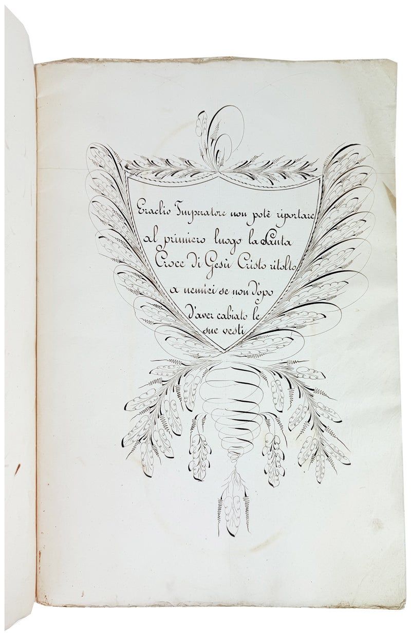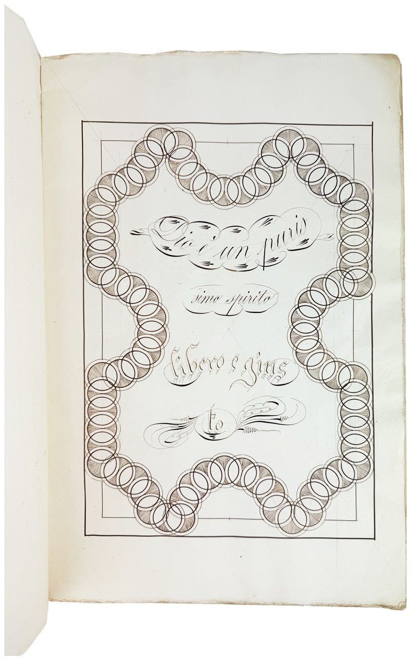 Rome, 1850. Very Good. Rome? 1850. Large folio (45cm.); stitched self-wrappers with elaborate calligraphic manuscript presentation in black and blue ink to upper wrapper; [12]ll. accomplished in black and blue ink manuscript on rectos only. Moderate wear including some creasing and dust-soil to upper cover, black ink occasionally burning through stock, else a Very Good, quite impressive survival.