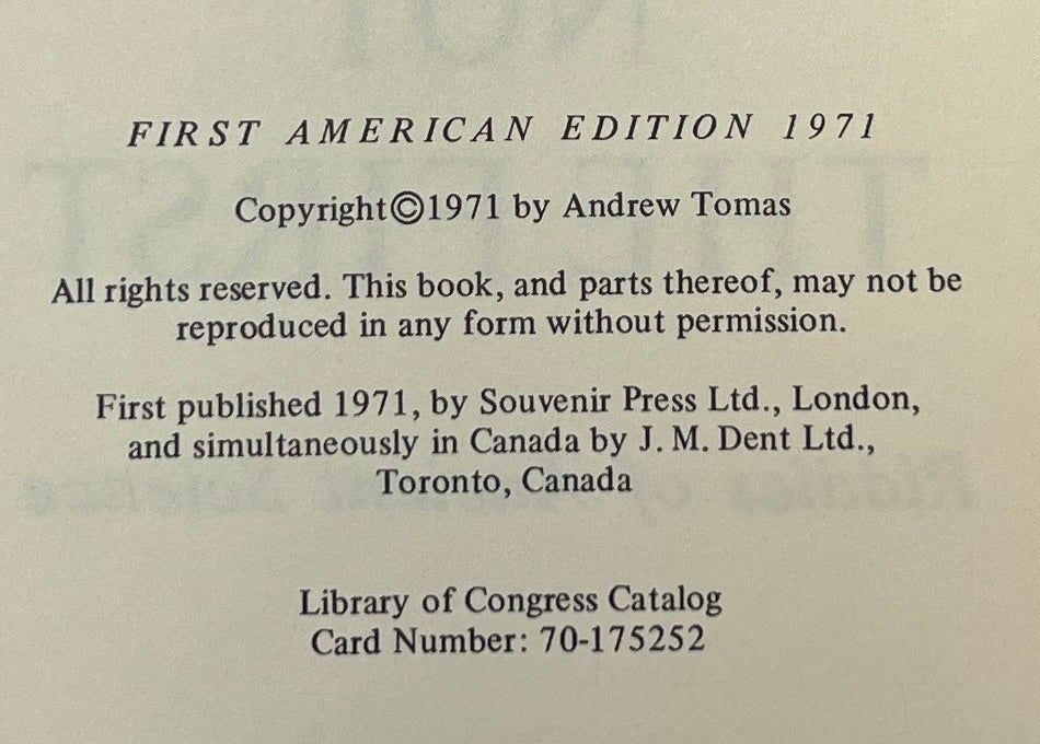 New York: G.P. Putnam's Sons, 1971. First Edition. Hardcover. Very Good/Good. Very Good in a Good jacket, unclipped ($6.95), faded at the spine, generally worn with creases throughout, some tears at the edges. Black cloth with green gilt lettering on the spine. Bound with some reading wear and askew, clean internally. Tomas's work that argues for an ancient origin for most modern technology. From the collection of ufologist Tom Benson.