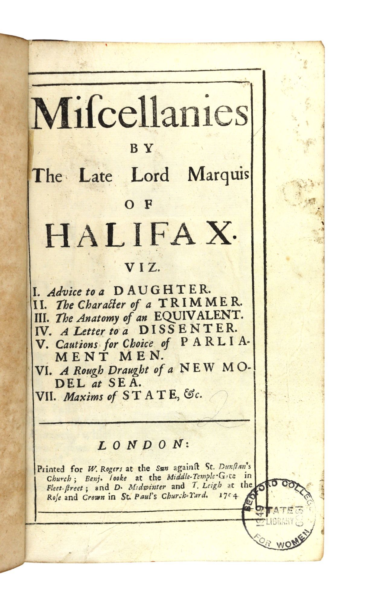 Miscellanies...Viz. I. Advice to a Daughter. II. The Character of a Trimmer. III. The Anatomy of an Equivalent. IV. A Letter to a Dissenter. V. Cautions for Choice of Parliament Men. VI. A Rough Draught of a New Model at Sea. VII. Maxims of State, &c