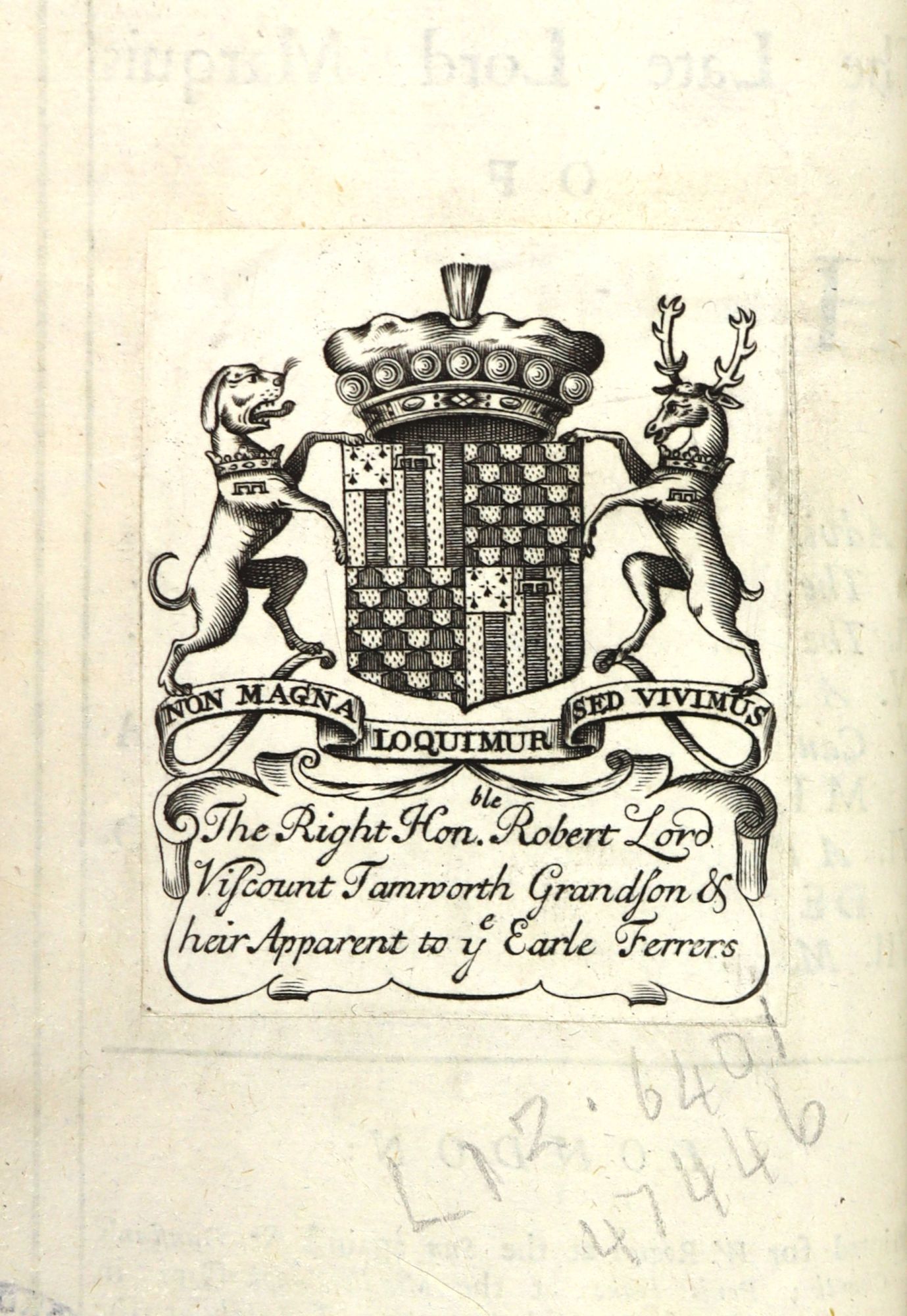 Provenance: Armorial ownership ex libris of Robert Shirley, Viscount Tamworth (1692-1714) to title page verso. Another unidentified armorial bookplate dated 1755 to front pastedown.