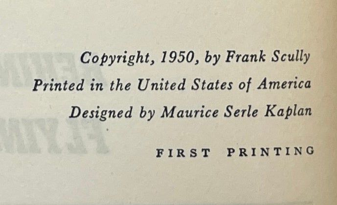 New York: Henry Holt and Company, 1950. First Edition. Hardcover. Near Fine/Good. Near Fine in a Good jacket, clipped, generally rubbed and worn, creases, tears, and chips throughout. Blue cloth with blue ink lettering and designs on the boards. Square and firmly bound, ownership signature of Tom Benson on the front endpaper, clean otherwise. Scully's work that theorizes the existence of magnetic propulsion and extraterrestrials. From the collection of ufologist Tom Benson.