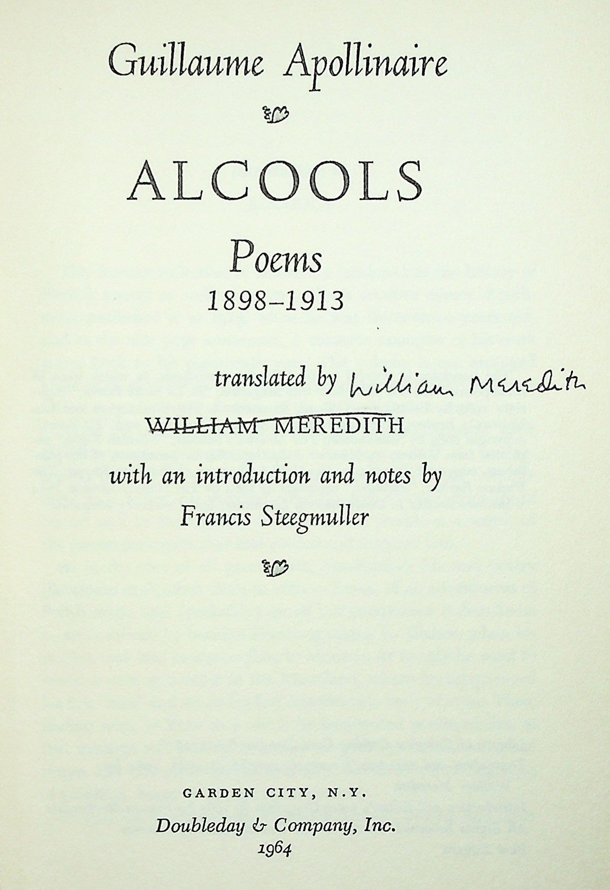 Garden City: Doubleday & Company, Inc, 1964. First Edition. Octavo (21.5cm); black cloth-covered boards, with titling and decoration stamped in gilt on spine; fore-edge untrimmed; dustjacket; 242pp. Inscribed by author on front endpaper: "For Alice and David Halliday with affection and esteem from their friend Guillaume / June 1976". Signed by translator, William Meredith, on title page. Light rubbing to board edges, else Near Fine. Dustwrapper, designed by Harry Ford, unclipped (priced $4.95), with trivial surface wear and rubbing to extremities, pencilled note to front flap, and 1" tape mend to tear at verso of lower rear panel; Very Good.