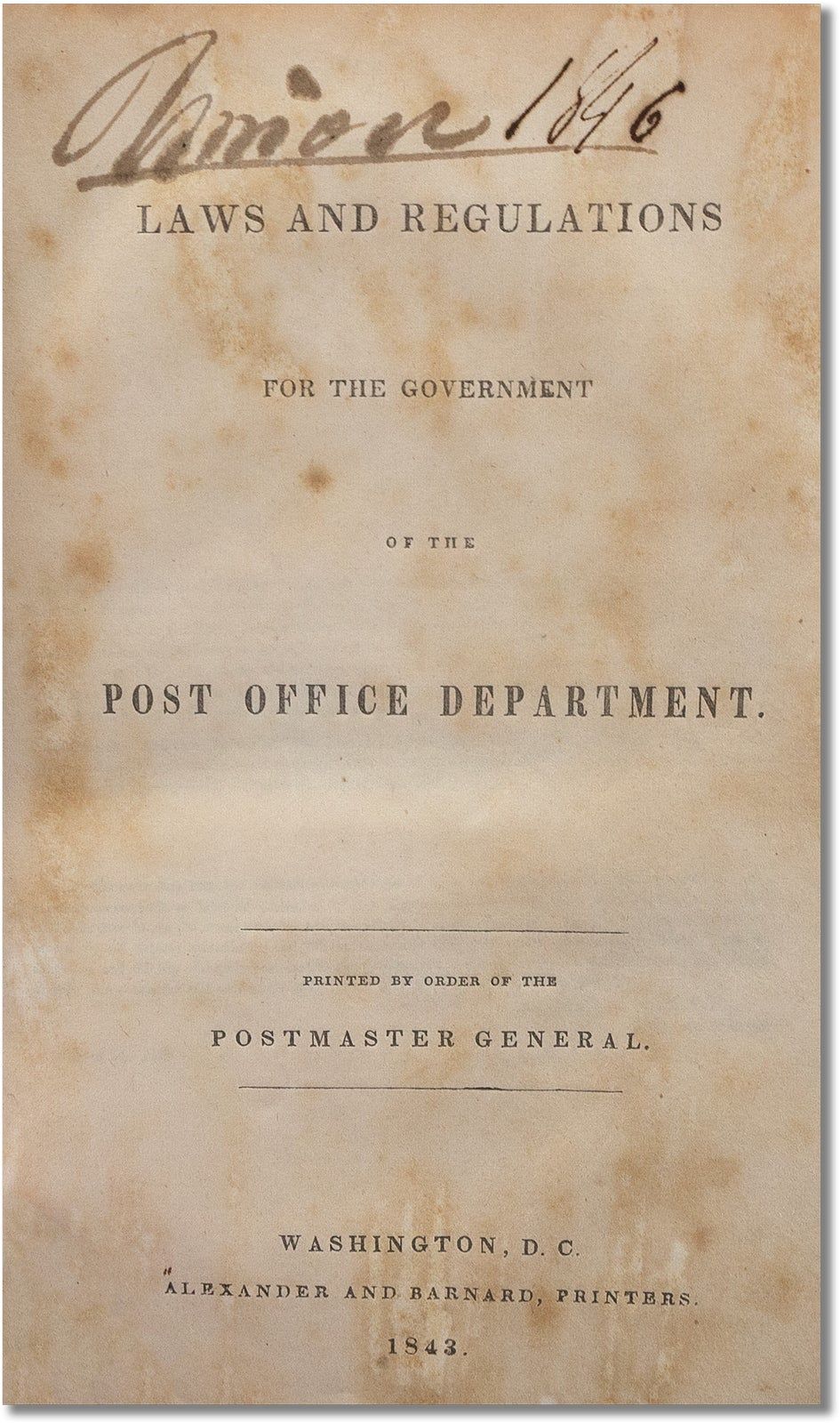 Printed by the order of the Postmaster General, Charles A. Wickliffe. Sections include Laws, Regulations, and an Index. Text concludes with eratum with notes for Deputy Postmasters will make four listed corrections with pen. [84737].