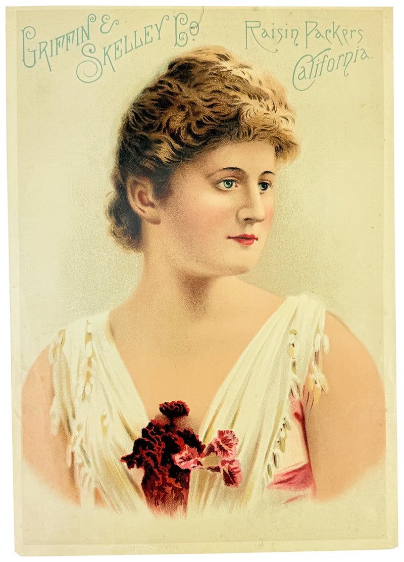 Fresno, CA: Griffin & Skelley Co, 1890. Very Good. [Fresno, CA]: Griffin & Skelley Co., n.d., [ca. 1890s]. Promotional chromolithographed pictorial broadside (28.5x20cm.) depicting a head and shoulders portrait of a beautiful young woman with a nosegay of carnations in her dress. Moderate wrinkling and dust-soil, closed tear to top margin touching letters without loss of meaning, else a Very Good, bright example.
