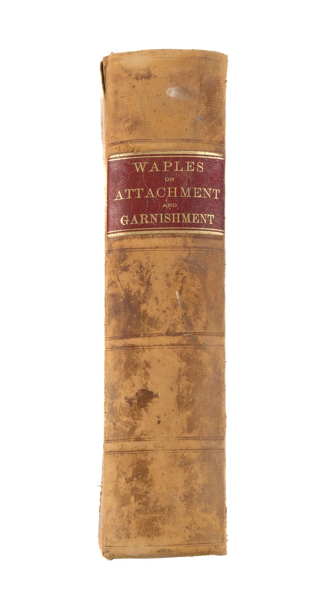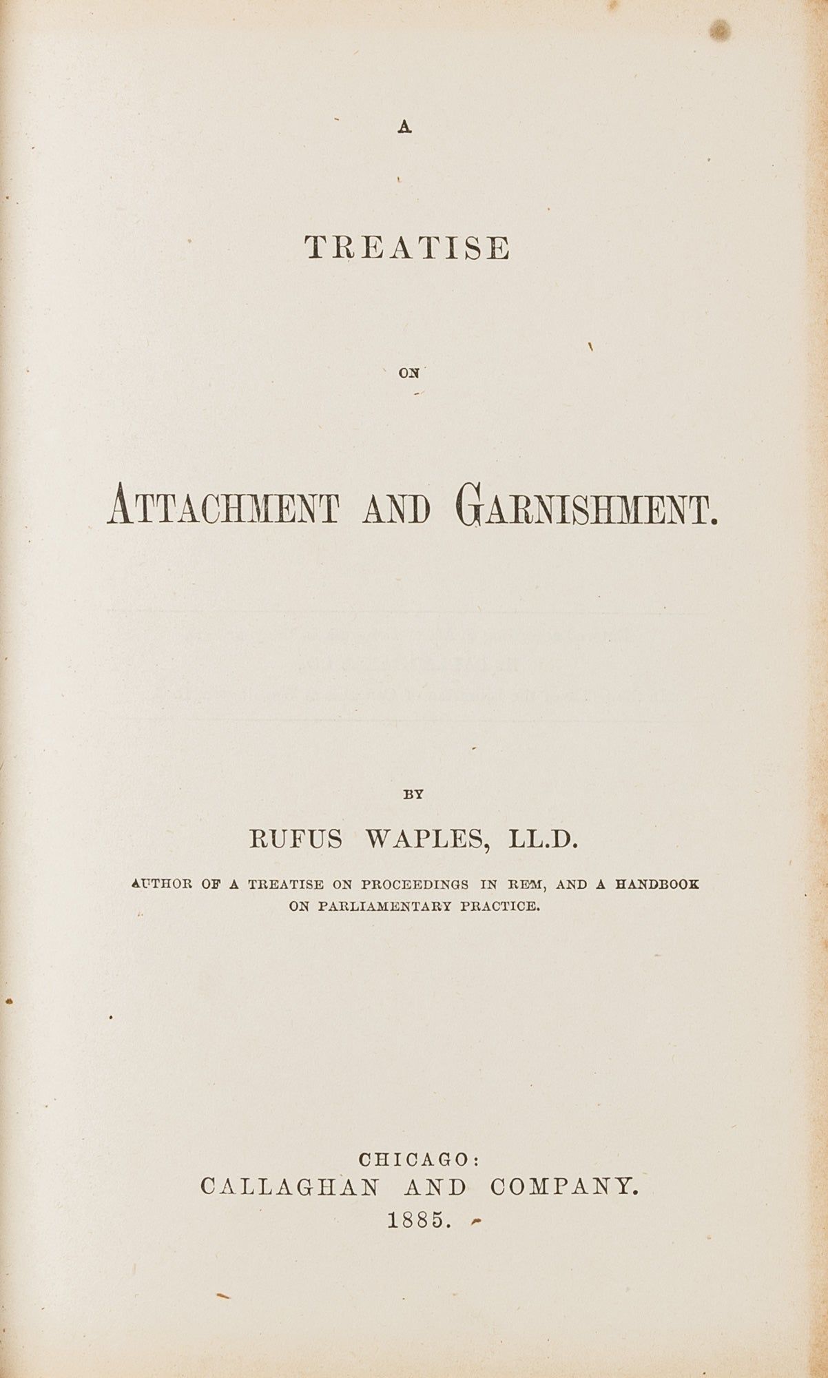 1885. Waples, Rufus, [1825-1902]. A Treatise on Attachment and Garnishment. Chicago, Callaghan and Co., 1885. lxii, 641 pp. Contemporary law sheep with raised bands and gilt stamped red lettering piece to spine. Worn and scuffed. Previous owner's inscription "C.L. Lewis/ Rapid City/ D.J." to front pastedown. Some offsetting to edges of endleaves, otherwise internally clean. $150. * This work analyzes the legal procedures of attachment and garnishment as they existed in the late 19th-century United States. As a legal treatise from the period, the book is considered a culturally important historical work. It helps legal scholars and historians understand the development of American law regarding debt collection and property seizure. Clarence Leslie Lewis [1851-1926] was a notable South Dakota judge and professor.