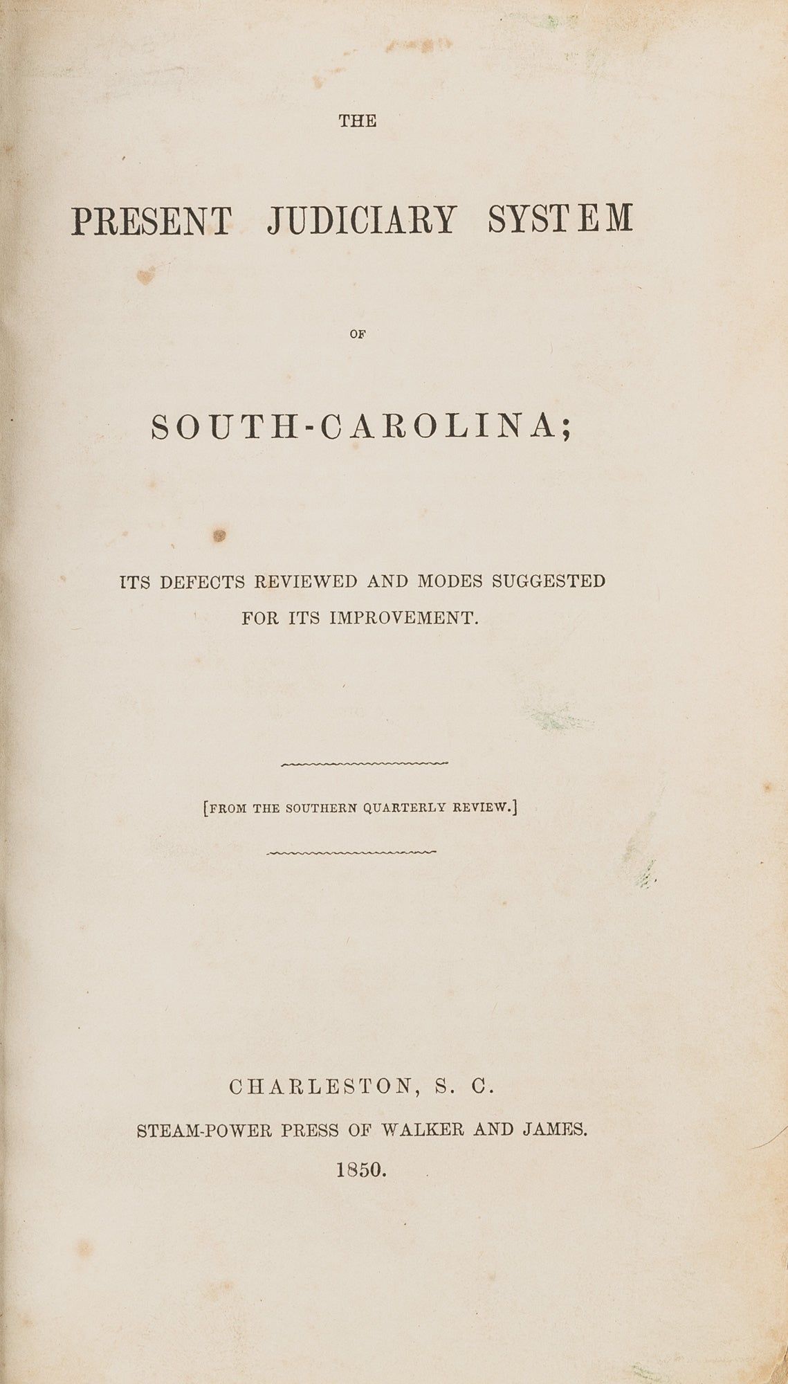 1850. Charleston: Steam-Power Press Walker & James, 1850. Charleston: Steam-Power Press Walker & James, 1850. Rare 1850 Pamphlet Proposing Reforms to South Carolina's Court System [Courts]. [South Carolina]. The Present Judiciary System of South-Carolina; Its Defects Reviewed and Modes Suggested for Its Improvement [From the Southern Quarterly Review.] Charleston: Steam-Power Press of Walker & James, 1850. 24 pp. Octavo (8-3/4" x 5-1/2"). Stab-stitched pamphlet in recent plain wrappers. Light toning, light wear to outer corners of text block, light foxing in places, a few minor smudges to title page. $650. * Only edition (as a pamphlet). The author, identified as "P" at the end of the text, describes the deficiencies of South Carolina's court system, mainly the small number of judges, who are overworked. Because they are kept "at a sort of mill-horse progress, round and round, through incessant circuits," they have "little of the necessary leisure for research, by which, alone, they can be enabled to keep pace with the progress of the profession" (4). As one would expect, the main proposed solution is the appointment of more judges with a corresponding reorganization of the court system that would minimize circuit riding. OCLC locates 1 copy (University of South Carolina). Sabin, A Dictionary of Books Relating to America 87918. Cohen, Bibliography of Early American Law 1048.