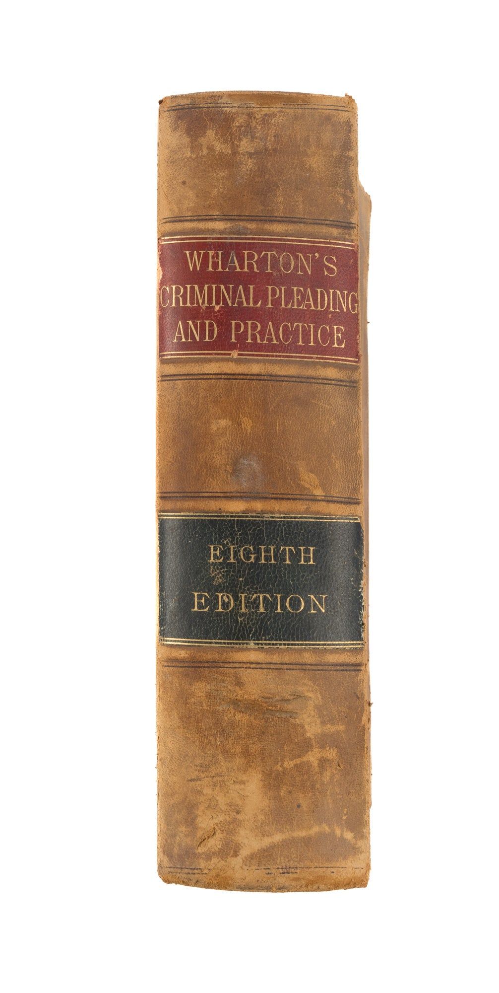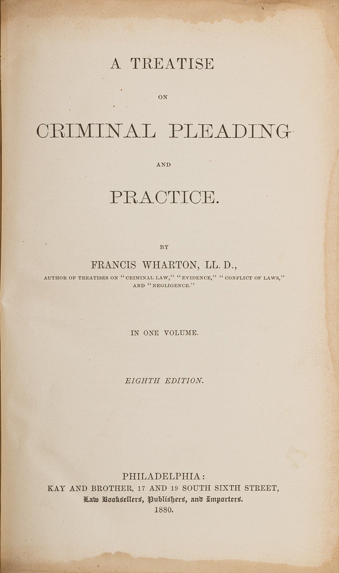 1880. Philadelphia, 1880. 8th ed.. Philadelphia, 1880. 8th ed. The Standard American Treatise on Criminal Law During the Second Half of the Nineteenth Century Wharton, Francis [1820-1889]. A Treatise on Criminal Pleading and Practice. Philadelphia: Kay and Brother, 1880. xi, 804 pp. Octavo (9" x 6"; 23 x 15 cm). Contemporary calf, red and black lettering pieces to spine. Moderate shelfwear, boards slightly bowed, front hinge cracked, owner's inscription, "C.L. Lewis/ Rapid City/ D.J.," to front pastedown. Moderate toning to interior, some offsetting to edges of endleaves. $150. * Eight edition. First published in 1846, this was the standard American treatise on criminal law during the second half of the nineteenth century. Its final edition, the ninth, was published in 1889. This work is an exhaustive legal guide covering criminal law and procedure in the United States during the late 19th century. The eighth edition was considered the authoritative American text on criminal law for its time. This book addresses the formal steps and legal processes involved in criminal cases, including Pleading: Details the written statements and pleas (such as "guilty" or "not guilty") used to begin or respond to a criminal prosecution; Practice: Covers the rules and steps of legal practice in the courtroom, including procedures like indictment, arraignment, trial, and punishment; Criminal Law Principles: Explains the foundational concepts of criminal law, outlining the rules that govern the prosecution and defense of crimes. This work is an important resource for legal historians, scholars, and those interested in how the American criminal justice system functioned in the late 1800s Clarence Leslie Lewis [1851-1926] was a notable Rapid City, South Dakota lawyer and judge. He also taught mining law at the South Dakota School of Mines and Technology. Catalogue of the Library of the Harvard Law School (1909) II:902.