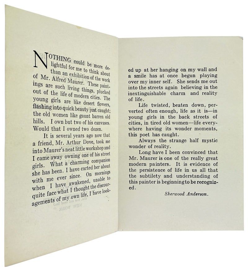 Scarce, brief advertisement for the American Modernist painter's exhibition. Anderson says of the artist's work, "Life twisted, beaten down, perverted often enough, life as it is...life everywhere having its wonder moments, this poet has caught."