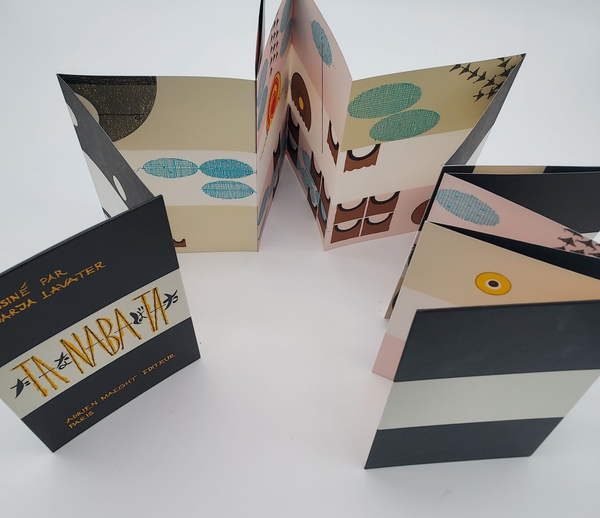 Paris: Adrien Maeght Editeur, 1994. First edition. Very Good. Octavo [21.5 cm] Accordion-folding artist's book composed of illustrated thin card boards. The boards are just a little concave. Housed in a matching thin card folder. The text is in English, French, and German. With a charming fold-out key to interpret the stories at the front. The noted Swiss artist's retelling through symbols of the story behind "Tanabata," an annual Japanese festival that celebrates the meeting of the star-crossed lovers Vega and Altair.