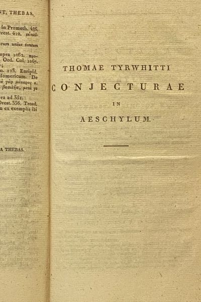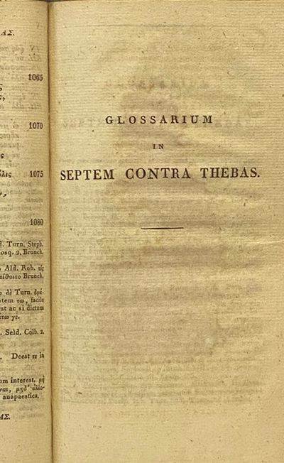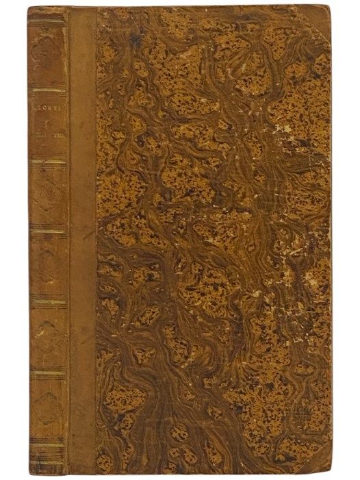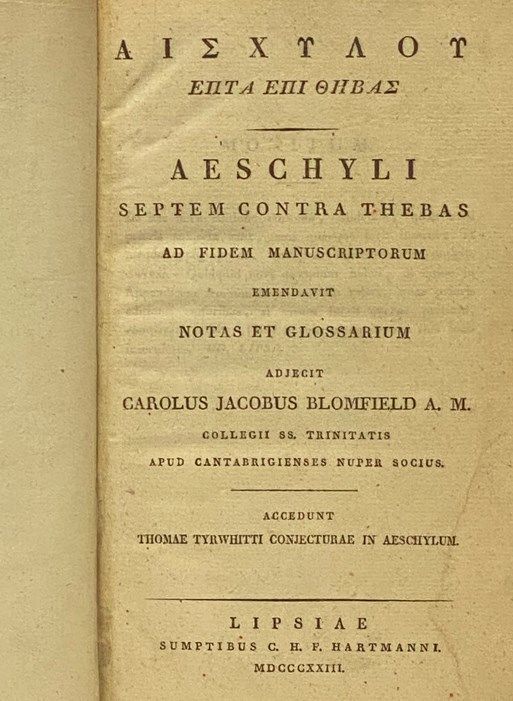 Lipsiae [Leipzig]: C.H.F. Hartmann, 1823. Half-Leather. Very Good/No Jacket. Boards lightly rubbed with fore edge corners slightly exposed, small sticker on corner of front endpaper, ink names and date on front endpapers, a few numbers in pencil on rear endpaper1956 Chateau-Margaux label laid in. 1823 Half-Leather. xii, 196 pp. Leather spine and corners, marbled boards and endpapers. Greek text with Latin footnotes and preface. Includes Aeschylus's Seven Against Thebes, with notes and glossary by Charles James Blomfield, and Conjectures on Aeschylus by Thomas Tyrwhitt.
