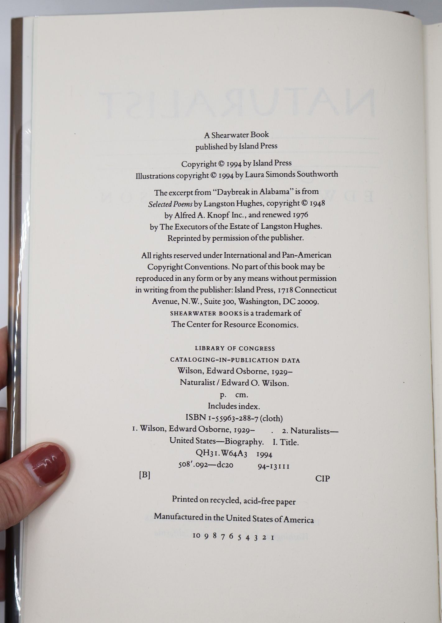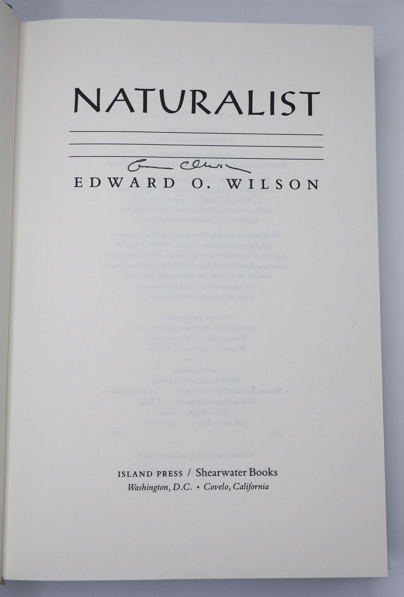 Washington, D.C; Covelo, California: Island Press; Shearwater Books, 1994. First Edition, First Printing. Hardcover. Octavo, 380 pages. In Very Good minus condition with a Very Good dust jacket. Spine mint green with black and teal lettering. Dust jacket protected with mylar covering. Slight shelf wear to edges of dust jacket and edges of boards. Spine slightly shaken. Minor staining and scuffing to edges of text block. Signed flat by Wilson on title page. DL Consignment. Shelved Case 10. 1396354. Shelved Dupont Bookstore.