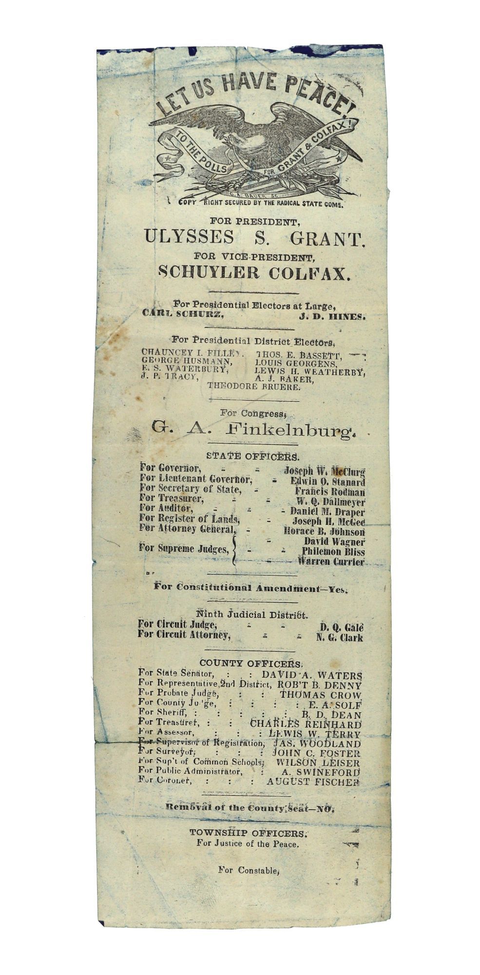 The Radical Republicans pushed for the complete and permanent eradication of slavery and supported Grant in '68, and here are supporting Missouri Congressional Candidate G.A. Finkelnburg as well. Noteworthy is also the push "For Constitutional Amendment - Yes," presumably referring to the 15th Amendment (the 14th was already ratified and adopted that July), prohibiting states and the federal government from denying a citizen's right to vote based on race, color, or previous condition of servitude. A rare survival of Grant campaign ephemera, and an illuminating record of the Reconstruction era's battling factions and ideals. More broadly, the piece has a certain congruity given the import of the Missouri Compromise of 1820, of which Thomas Jefferson said, "I considered it at once as the knell of the Union. It is hushed indeed for the moment. But this is a reprieve only, not a final sentence." Not separately cataloged in OCLC.