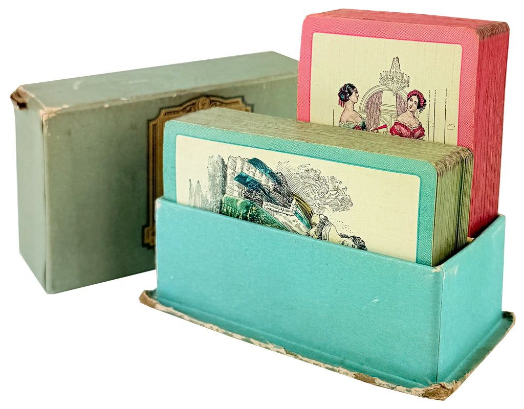 New York: Fan-C-Pack Co, 1930. Very Good. New York: Fan-C-Pack Co., n.d., ca. 1930s. Set of two packs of playing cards (52 cards a piece, complete), one set adorned with a Godey's fashion plate printed within pink border, the other pack adorned with a different plate bordered in blue-green, housed together in original compartmented and capped pictorial box. Moderate wear and toning to box, else a Very Good example, playing cards in near fine condition.