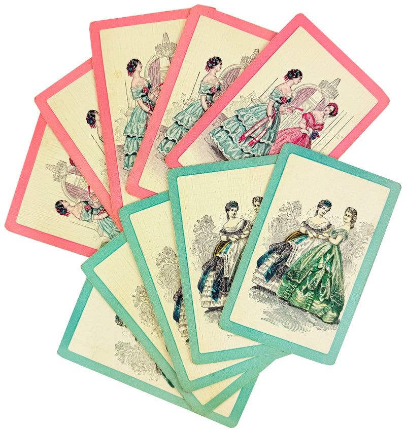 The fashion and literary magazine "Godey's Lady's Book" ran from 1830 through 1896, reaching a peak of 150,000 subscribers in the years leading up to the Civil War. Though long defunct by the time this pack of playing cards was produced, bound issues still rattle around the country even today, a nostalgic reminder of a more whale-bone corseted era.