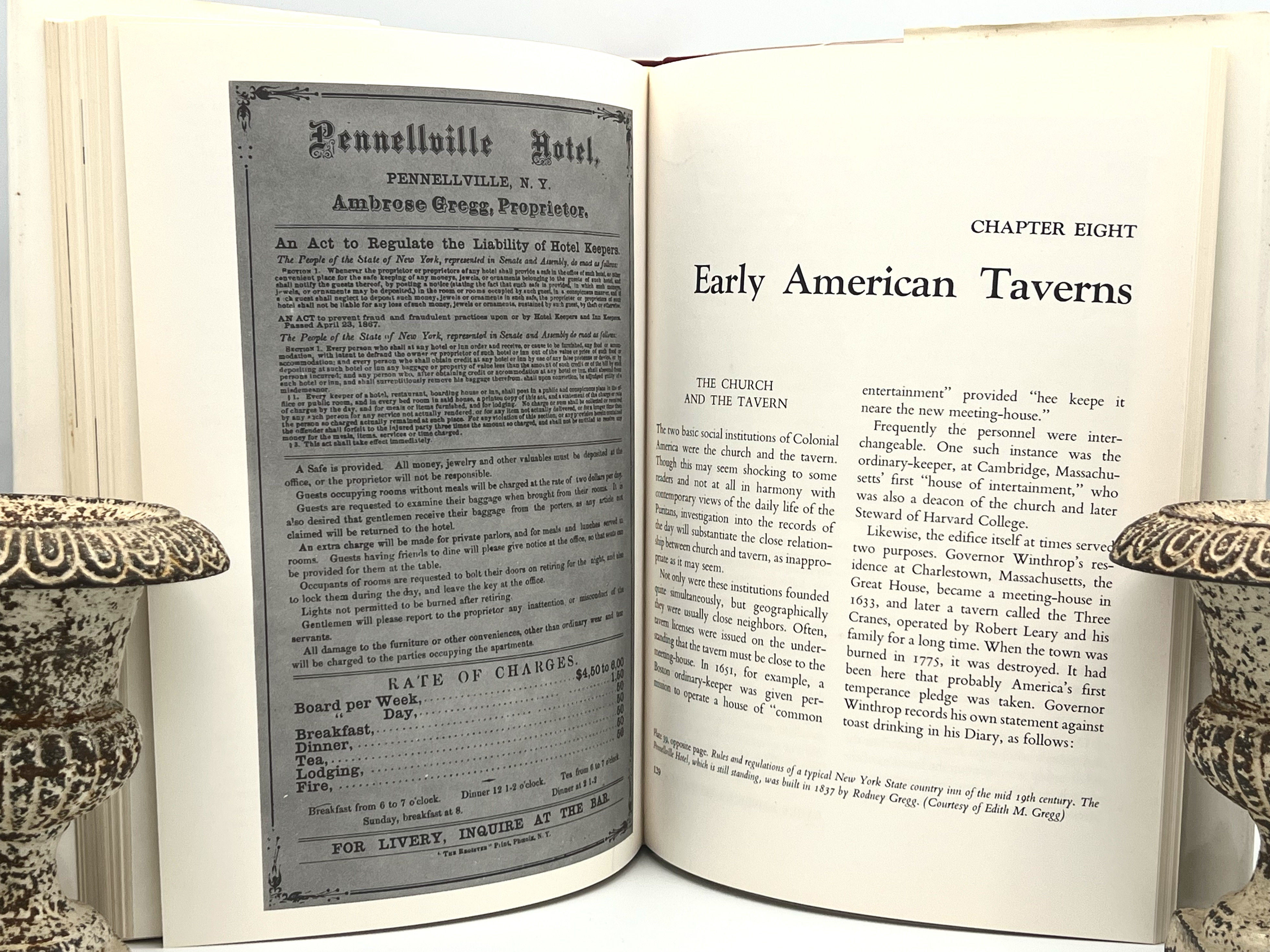 New York: Charles E. Tuttle Company, 1966. Bonanza Books. Hardcover. Red cloth covered boards. Very good, in good dust wrapper. 171 pages. 28 x 22 cm. A extensive look into the importance of alcoholic and other beverages in early American life accompanied by recipes and history. A description of beverages in the New England, Middle, and Southern Colonies along with chapters on Ale & Beer, Cider & Perry, Liqueurs and Cordials, Miscellaneous Mixed Drinks, Temperance Drinks, Medicinal Beverages, Wines, Early American Taverns, a Glossary and Bibliography. Illustrated throughout. Interior crisp and clean. Dust wrapper lightly soiled on rear cover.